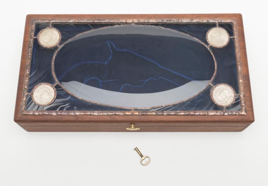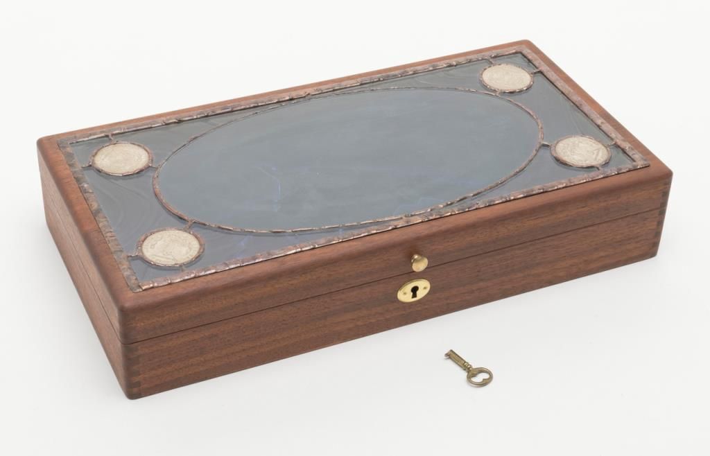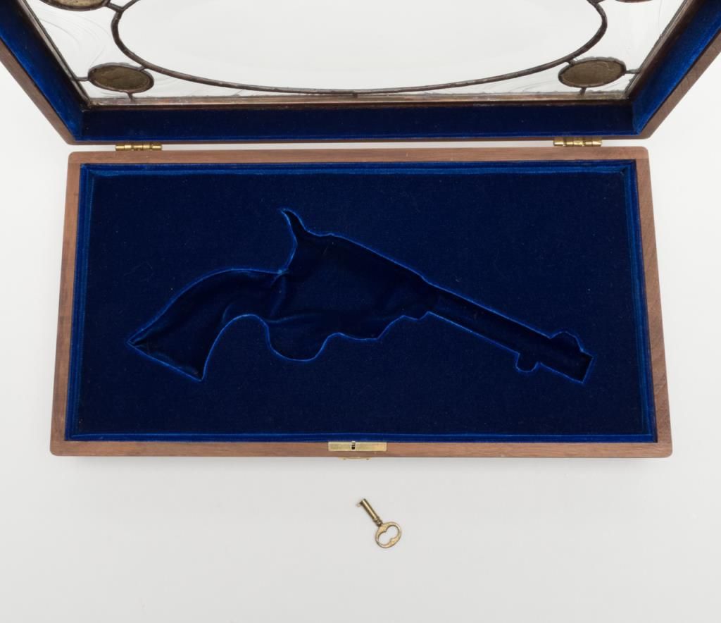 Beautiful custom made wood and leaded glass display case for a Colt SAA revolver with a 5-1/2” barrel (gun not included); fitted blue interior, leaded glass lid has 4 U.S. Morgan Silver Dollars incorporated in the design! Est.: $200-$400.