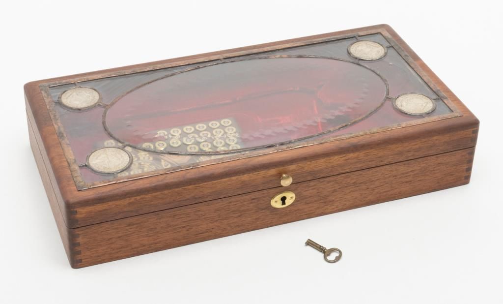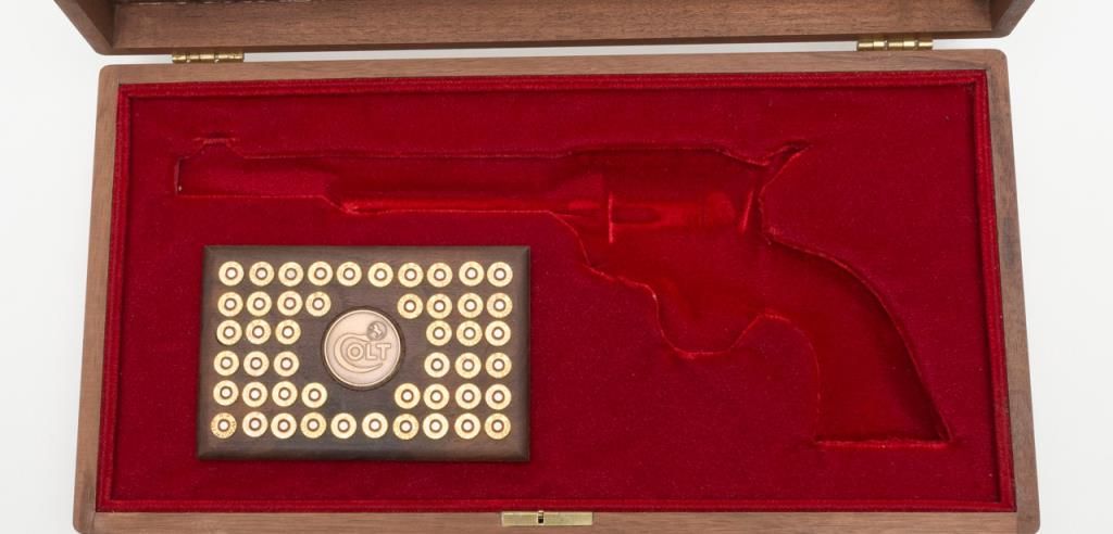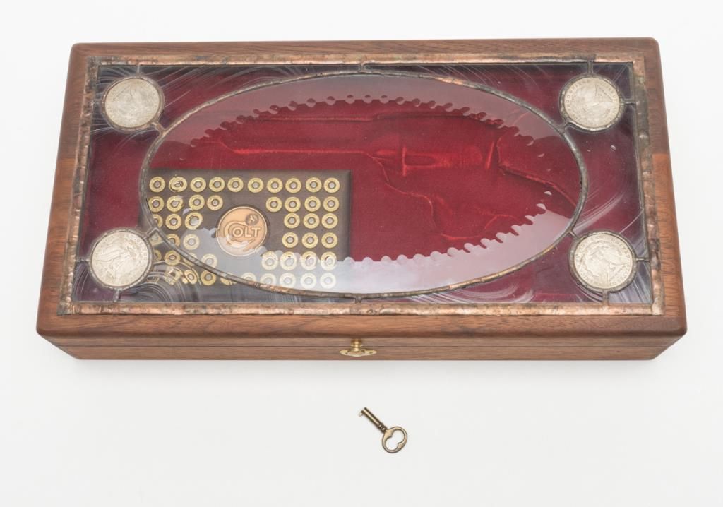 Beautiful custom made wood and leaded glass display case for a Colt SAA revolver with a 7-1/2” barrel (gun not included); fitted red interior, leaded glass lid has 4 U.S. Morgan Silver Dollars incorporated in the design; interior also has awood cartridge block with Colt insignia disc. Est.: $200-$400.
