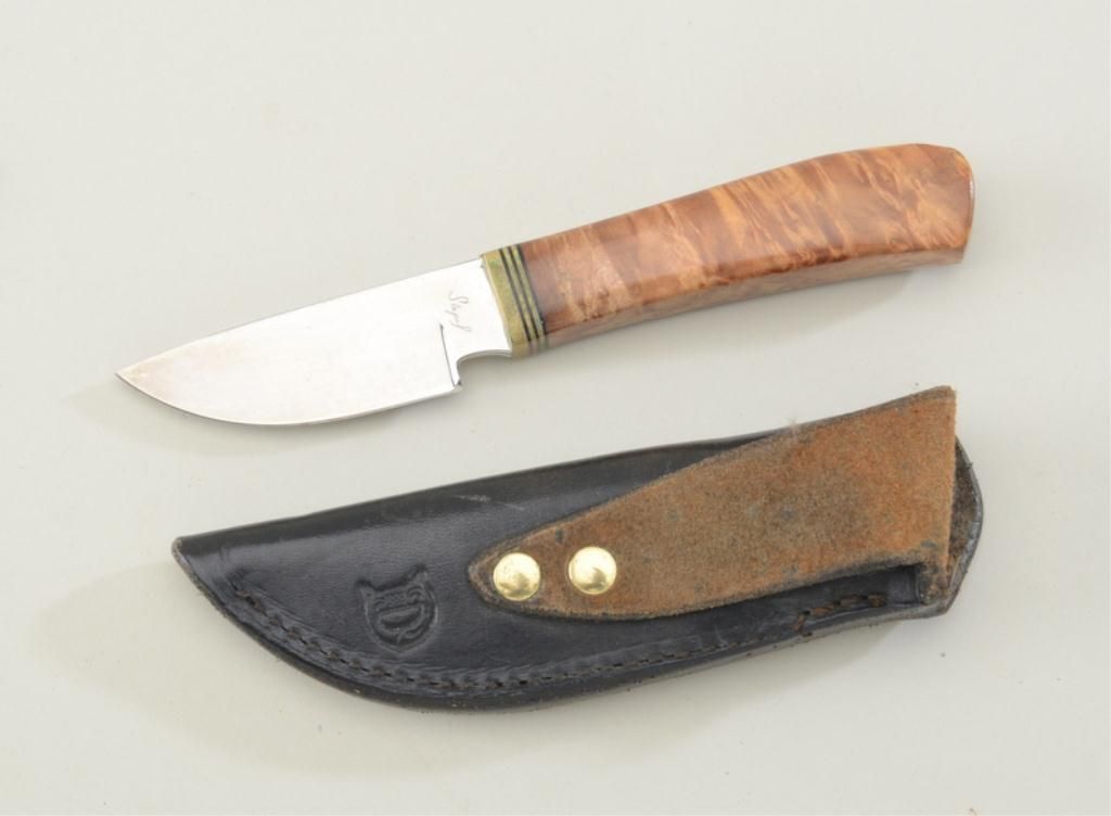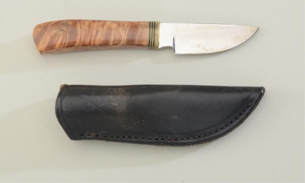 Beautiful custom skinning knife by Staple with exotic wood grip in fine condition with leather sheath. Est.: $50-$100.