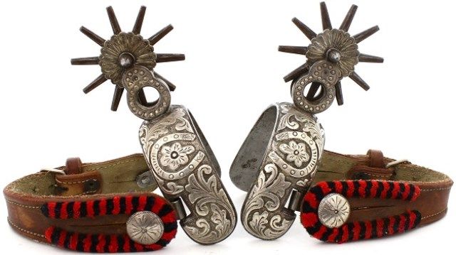 C. 1940-1950's with high relief engraving, 1 1/2" heel bands, large 3 point rowels and period wool tufted 2 piece leather straps. Est. 600-850