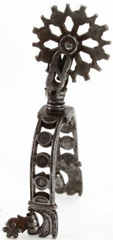 with pierced heel band, floral swinging buttons, pierced snake syle shank and terrific large 2 1/4" rowel with single engraving. Est. 250-400