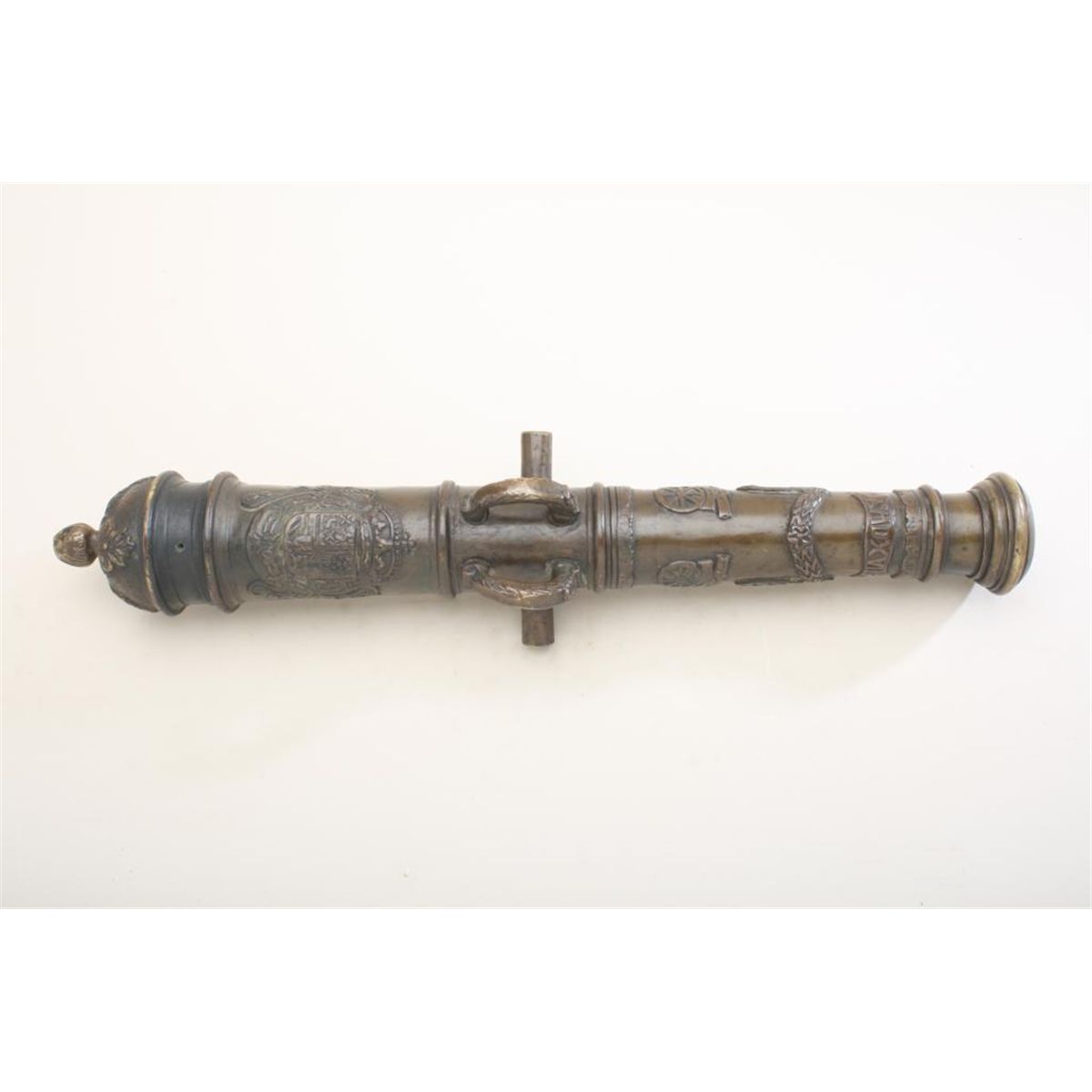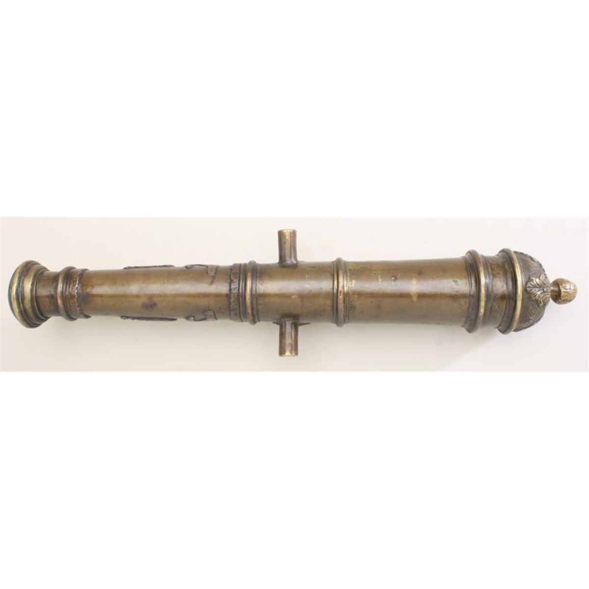 Beautiful early cast bronze cannon approx. 28” overall with raised cannons on carriage decorations at the muzzle of the cannon barrel and large raised crest on the breech end; beautiful dark uncleaned patina. Thispiece would make a stellar display in any gunroom or office of the serious collector of antiquities. Est.: $1,250-$2,500.