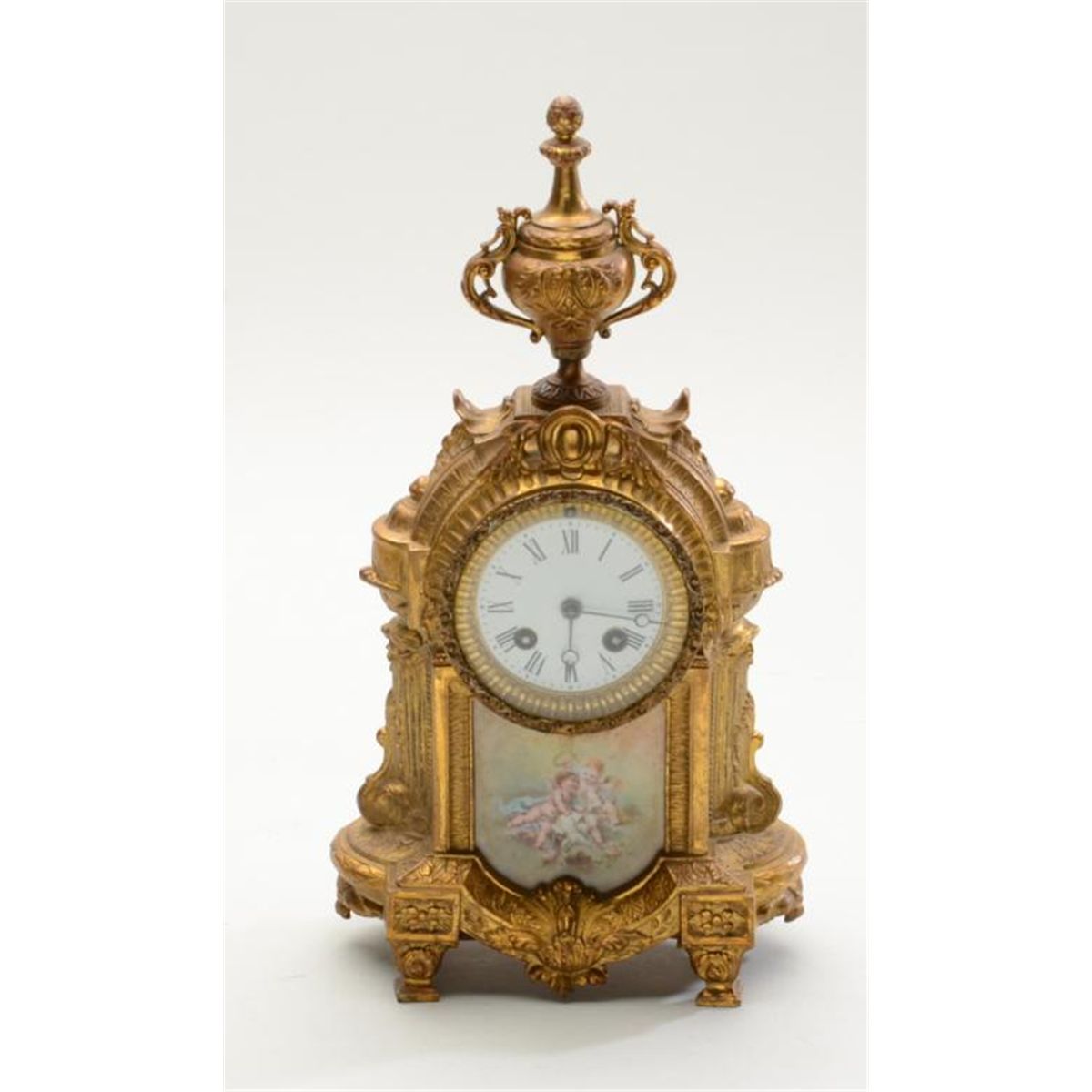 Beautiful gold gilded metal antique mantle clock approx. 14” in height, 8” wide and 5” deep with beveled glass face cover, porcelain face, decorative angels front piece in overall fine condition with key; unknownworking condition but appears complete. Est.: $150-$300.