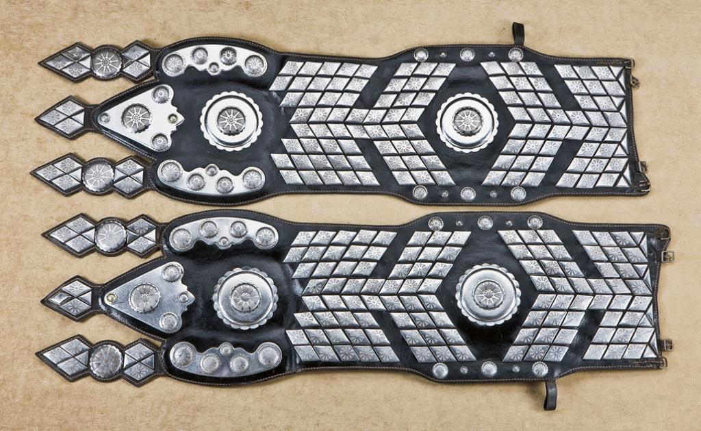 Beautiful hand-crafted western-style parade saddle by Emdee of Missouri showing Ted Flowers type nickel silver conchos with etched decorations, beautiful carving with florals and horseheads. Matching trapaderos, breast piece, drops, bridle, and a full parade quality ensemble. Very good plus to near fine condition. Est: $4,000 - $8,000