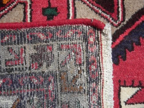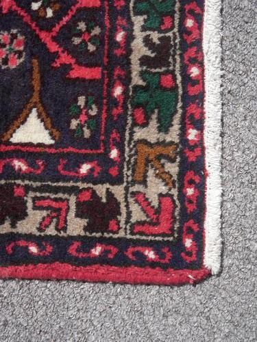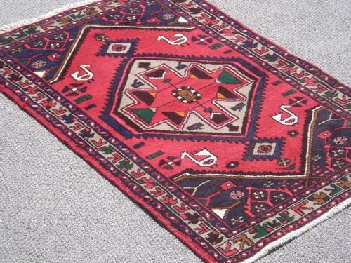 Beautiful hand woven Persian Hamadan. Made of fine quality baby lamb's wool pile on cotton foundation, all natural vegetable dye. Hand woven in City of Hamadan from Iran. Looking at this piece, the contrast of colors and its geormteric design, captures your attention. The beauty of the color selection, the sophistication of its desgin considering its central medallion and the corner compostions, is what make this Rug a masterpiece. Size: 4 feet 5 inches X 3 feet.