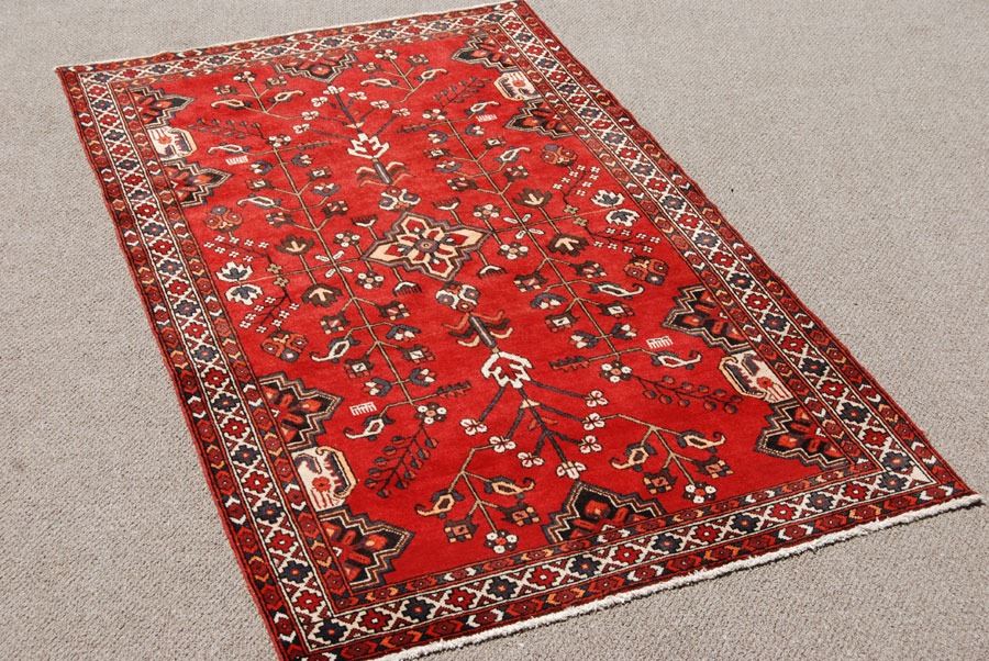 Beautiful hand woven Persian Nahavand Rug. Made of fine quality baby lamb's wool pile on cotton foundation, all natural vegetable dye, the weaver utilized a very rare and unique looking design, incorporates allover floral pattern on a rich red background. Hand woven in City of Nahavand from Iran. Size: 4 feet 7 inches X 8 feet.