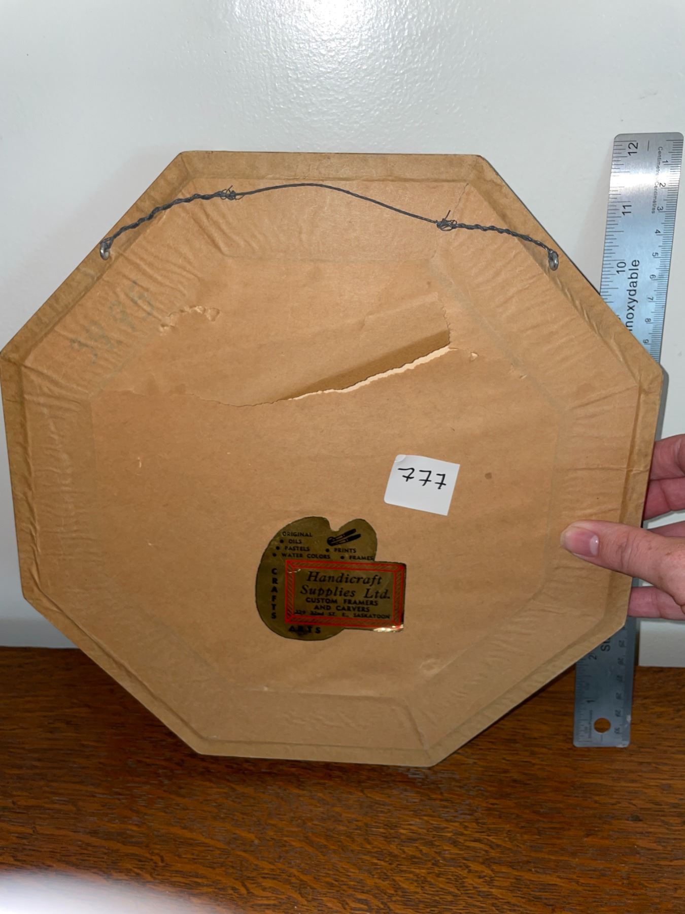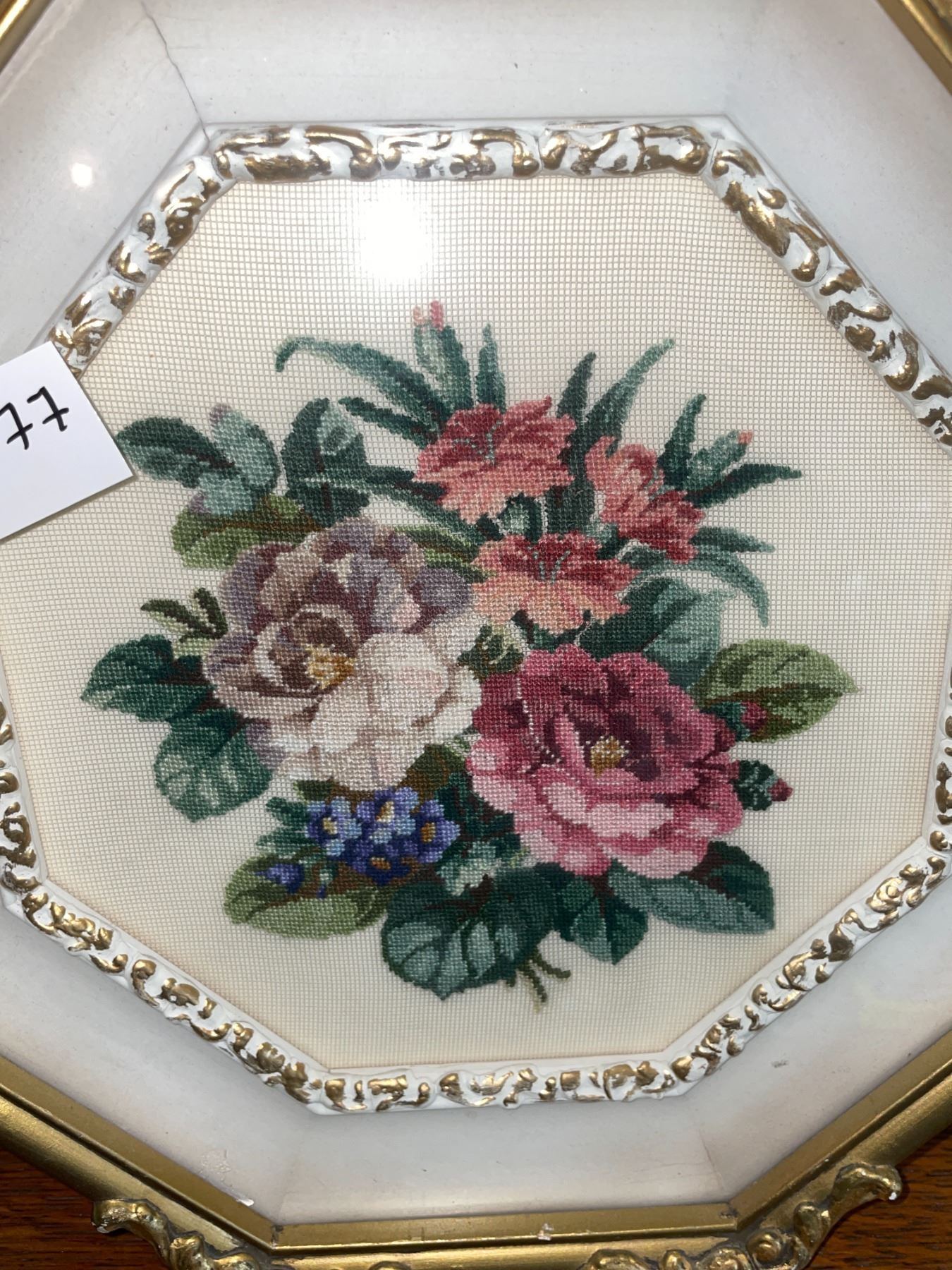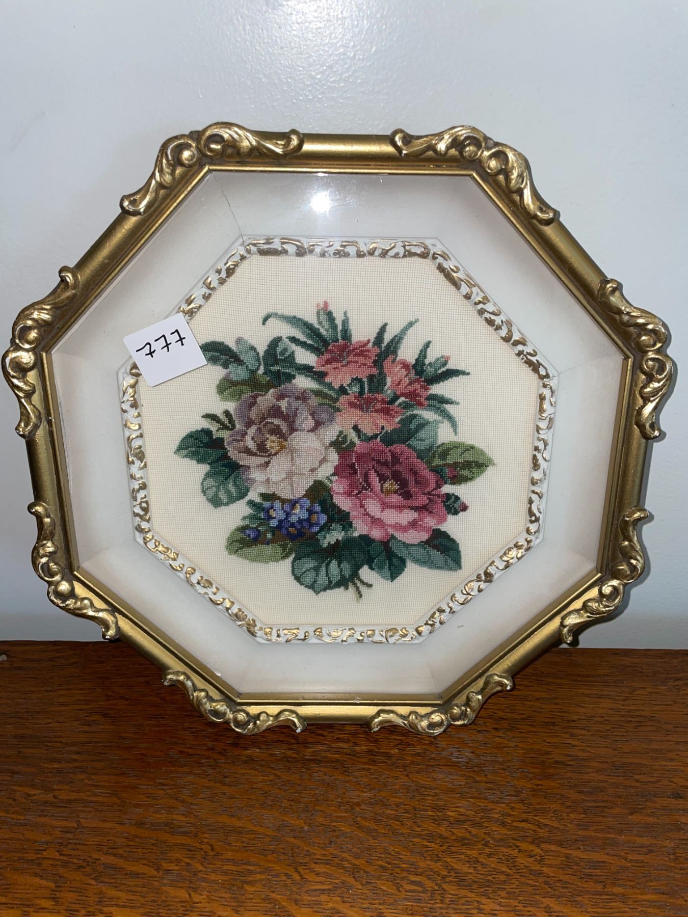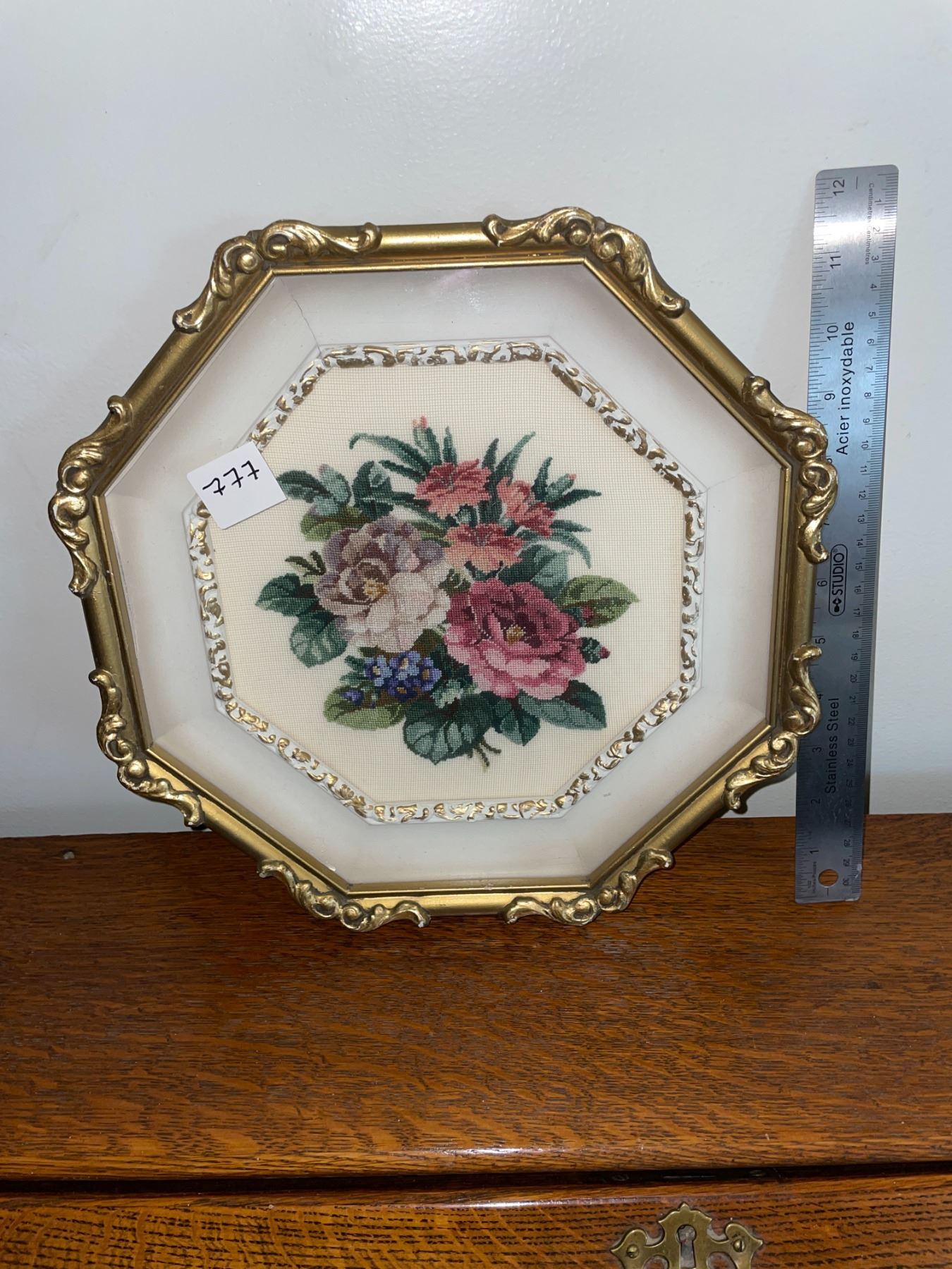 Beautiful, handmade, cross stitch, floral pattern, in gold, octagonal frame