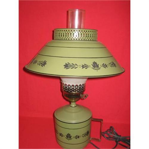 We are offering this beautiful handpainted Toleware Table lamp in good condition. The colors are Sage background and black painting.