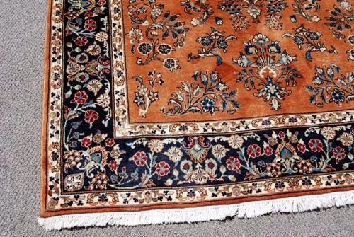 Simply spectacular highly detailed Persian Sarouk. Made of fine quality lamb's wool pile on cotton foundation, all natural vegetable dye, incorporating a highly detailed allover free flowing floral pattern on a red colored background; and contrasted beautifully by an intricately done floral border. hand woven in sarouk, Iran. about sarouk rugs: the thickness of the luxurious pile allows sarouk rugs to withstand the level of foot traffic that would be typical in hallways, common rooms and foyers. the style, quality and durability of sarouk rugs have made them extremely popular with western consumers then and now. sarouk carpets derive their name from an obscure village in Persia, located twenty miles north of arak (formerly Sultanabad). over a short span of history, this village produced some of the most highly regarded Persian weavings of the late 19th to early 20th century. Size: 5 feet 8 inches X 8 feet 6 inches.