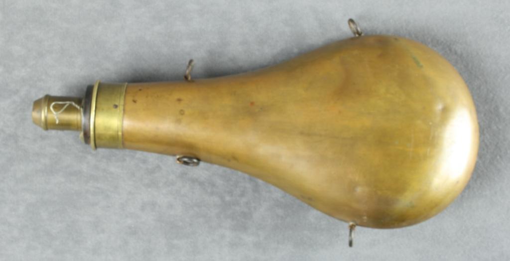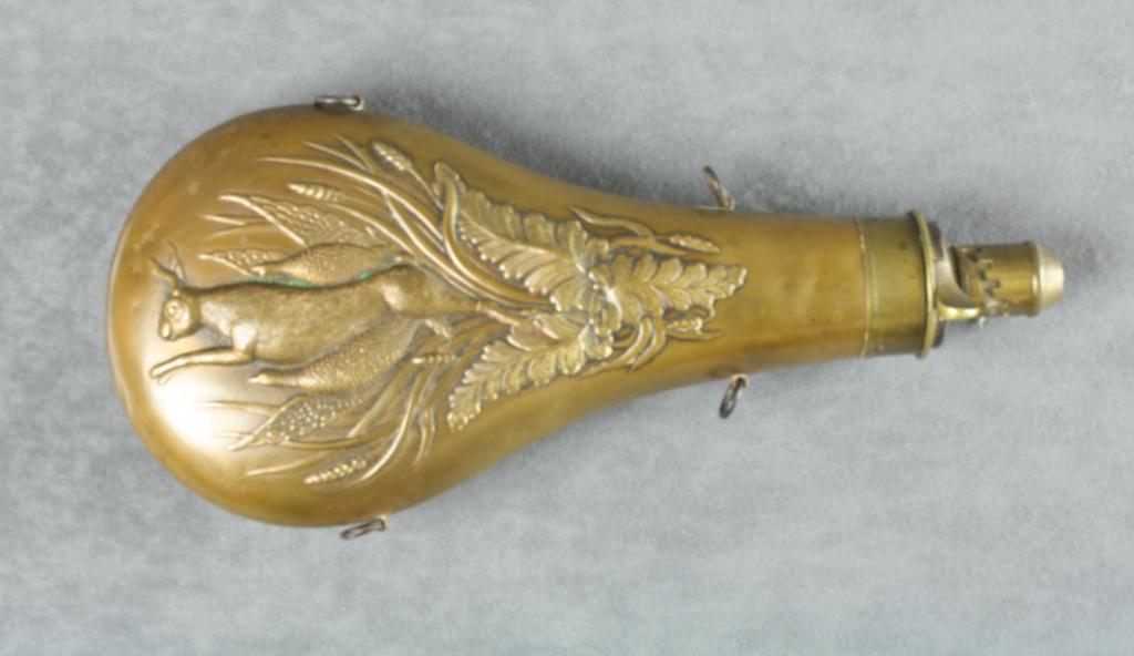 Beautiful huge brass shotgun flask approx. 10” overall with graduated charger and hanging rabbit and bird embossed scene with great patina and overall very good condition. Est.: $150-$300.