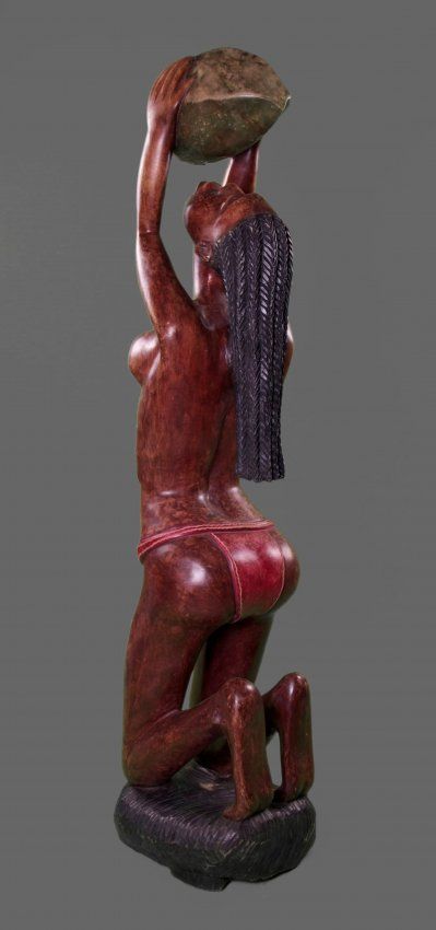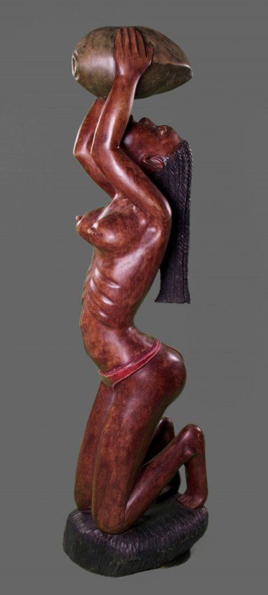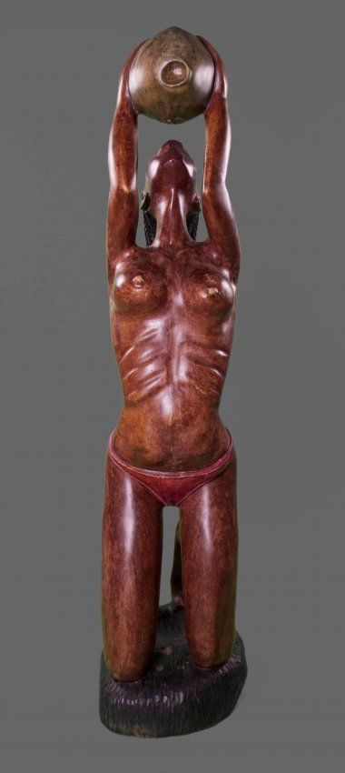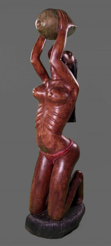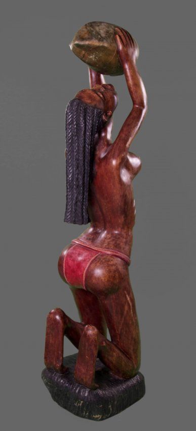 Beautiful large African wood carved statue. Size: 47" x 10" x 13".