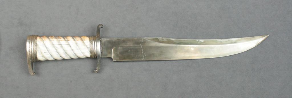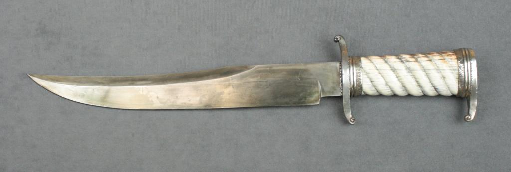 Beautiful large Bowie style knife approx.  15-1/2” overall with an approx. 11” unmarked  blade, silver cross guard and pommel with  walrus tusk ivory turned grip. This custom  knife is in overall very good conditionshowing tasteful silver mounts, fancy ivory  grip and displaying the initials “DR” on the  lower front side of the cross guard which we  surmise may be the maker.  Est.:   $600-$1,200.