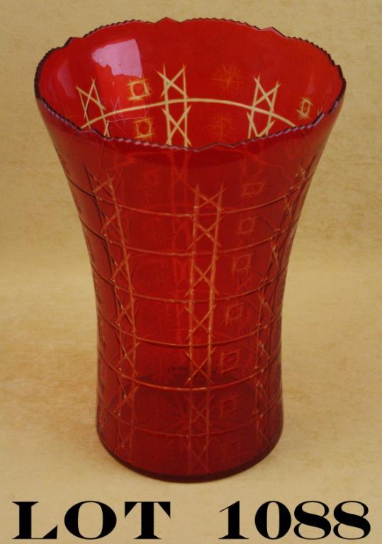 Beautiful large antique cranberry cut vase, approx. 14” high and approx. 10” in diameter with a lovely scalloped rim in overall excellent condition at time of description; design is of the snowflake style. Est.:$300-$600.