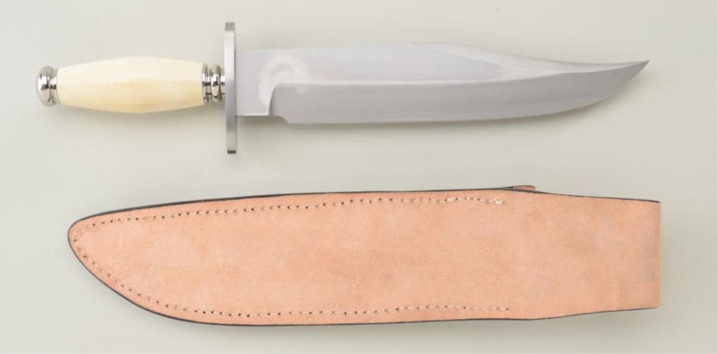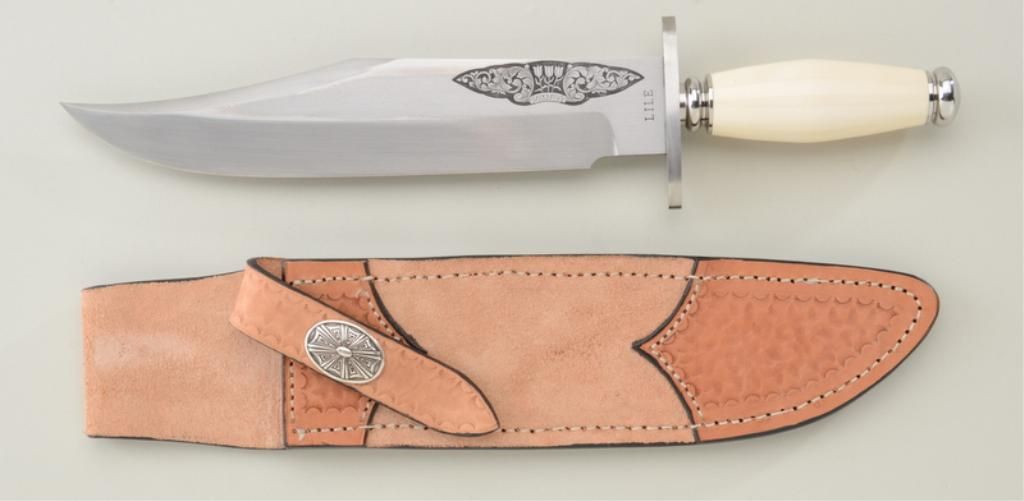Beautiful large clip point bowie custom modern knife by Lile in like new condition showing etching on the left side of the blade and the dates 1933-1991 with ivory grip and leather sheath, approx. 15” overall with anapprox. 10” blade. Est.: $600-$1,200.