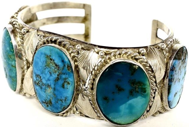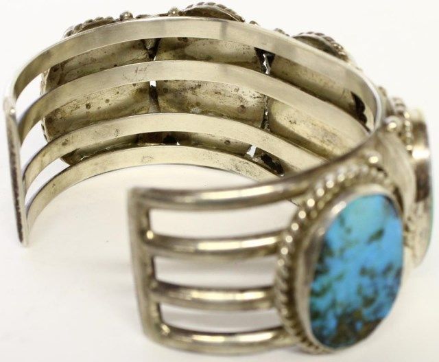 silver, set with 5 large turquoise stones, 1 1/2" wide. Est. 450-800