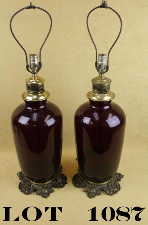 Beautiful large old pair of cranberry glass lamps with ornate brass bases and brass kerosene tops that have been converted to electric approx. 29” in height and in excellent condition at time of description;no shades. A really nice set that would go nicely in any den or formal “parlor”. Est.: $175-$350.