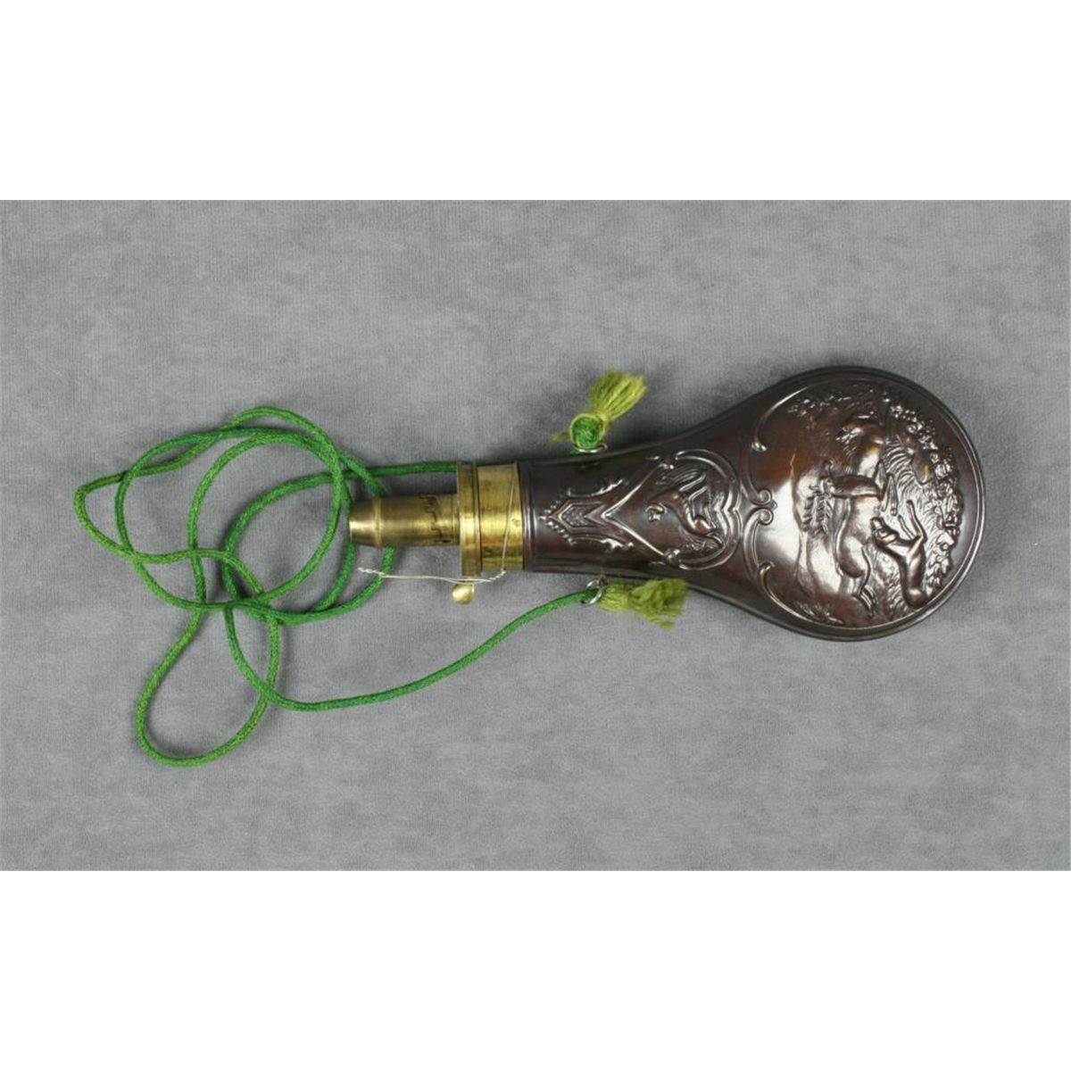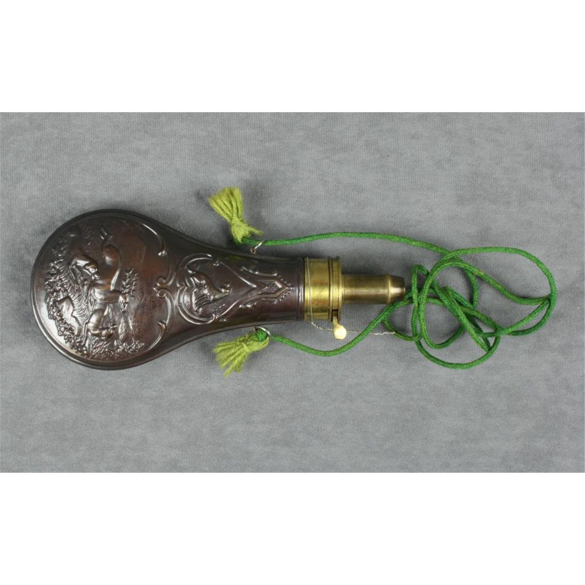 Beautiful later brass shotgun flask with embossed game scenes and hanging cord in overall very good condition. Est.: $25-$50.