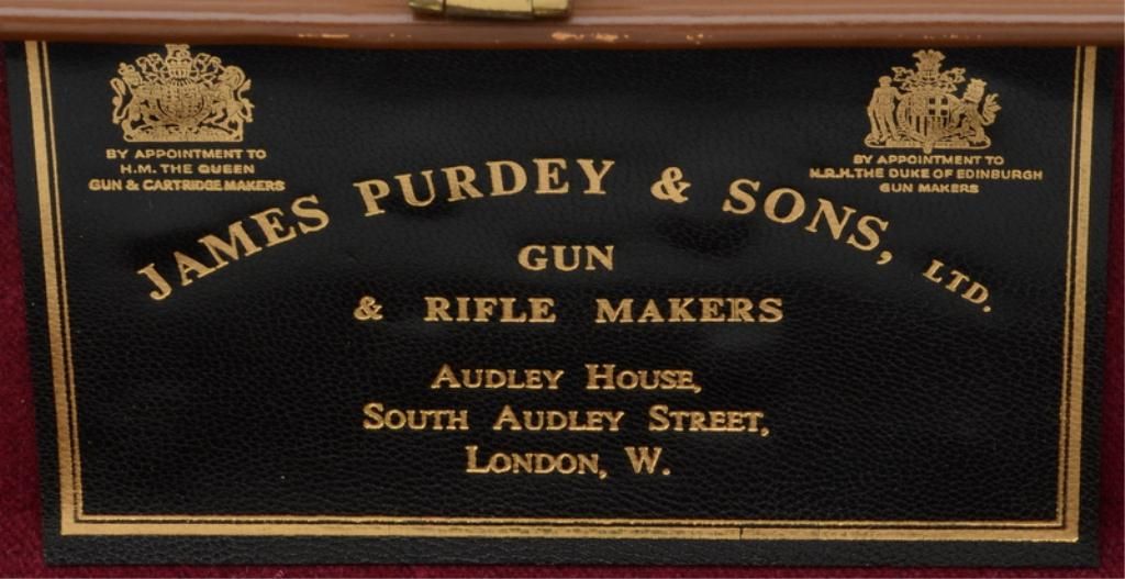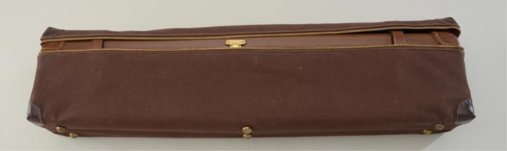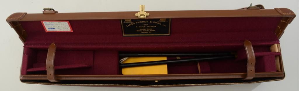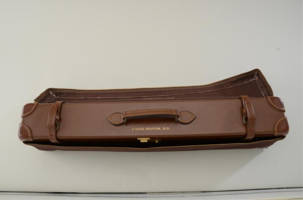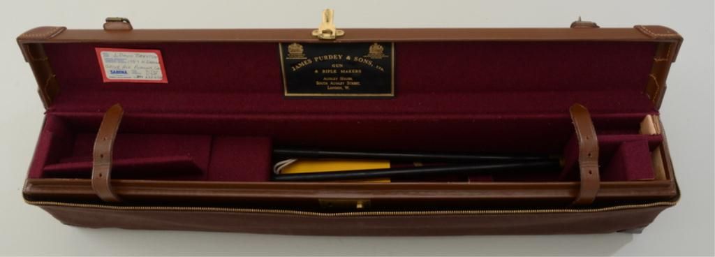 Beautiful leather shotgun case with canvas cover showing James Purdey & Sons label in lid and Ambercrombie & Fitch Co. stamp on lip of case; in overall fine condition with case embossed “J. David Brayton, M.D.” and thecover embossed “Brayton”. Est.: $150-$300.