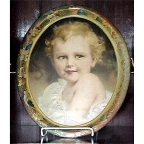 This is a lovely decorative tin tray from the turn of the last century. It features a beautiful child as the center with fall foliage around the edges. The tray is a 7 out of 10 in condition with several dings to the face and scratched to the trim at the bottom. It is a cherubic and engaging image of the baby that will make you want to own it.