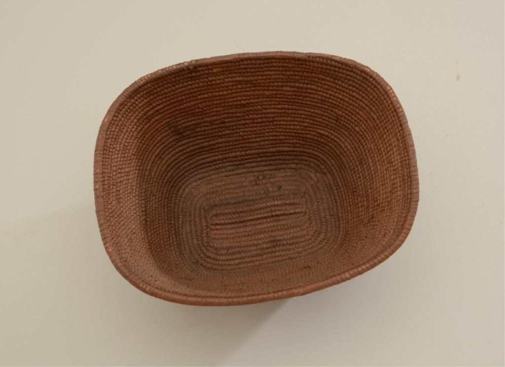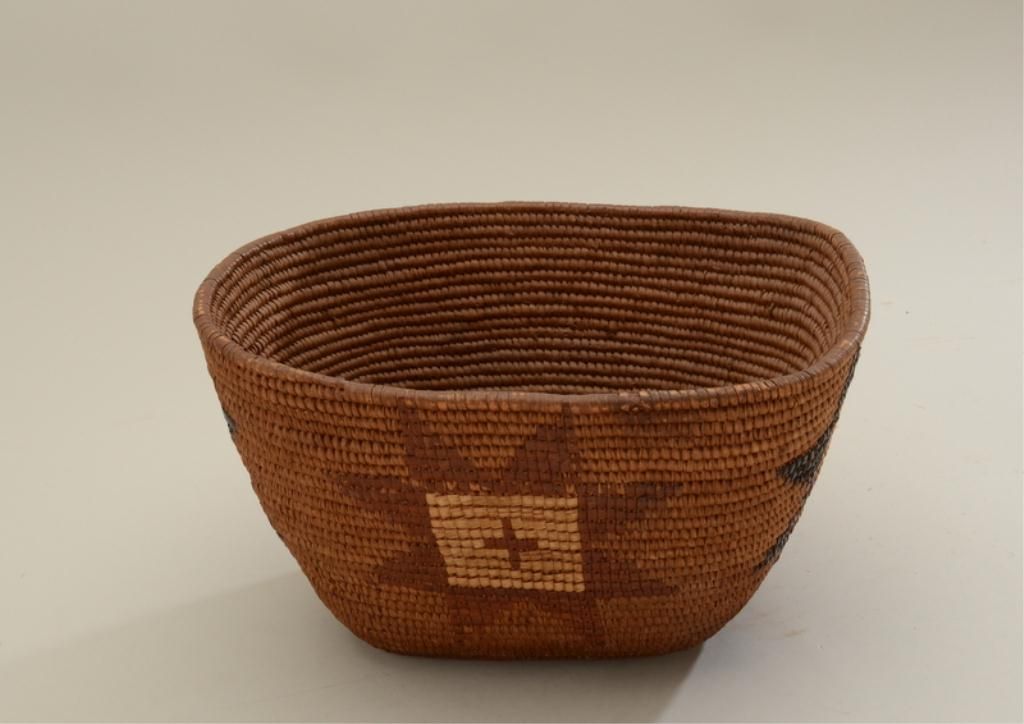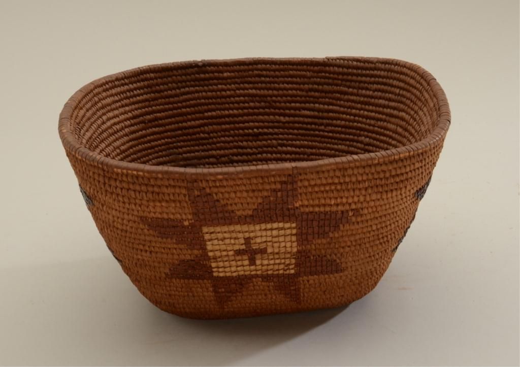 Beautiful medium sized woven Indian basket approx. 6” in height, approx. 9-1/2” wide and approx. 11-1/2” long in overall very good condition showing cross and star designs on all sides. Est.: $200-$400.