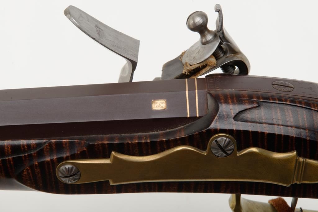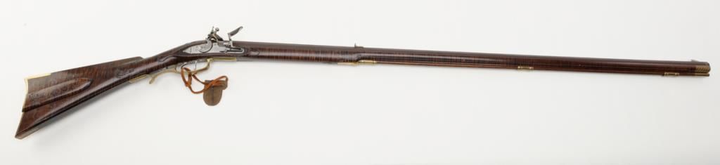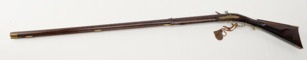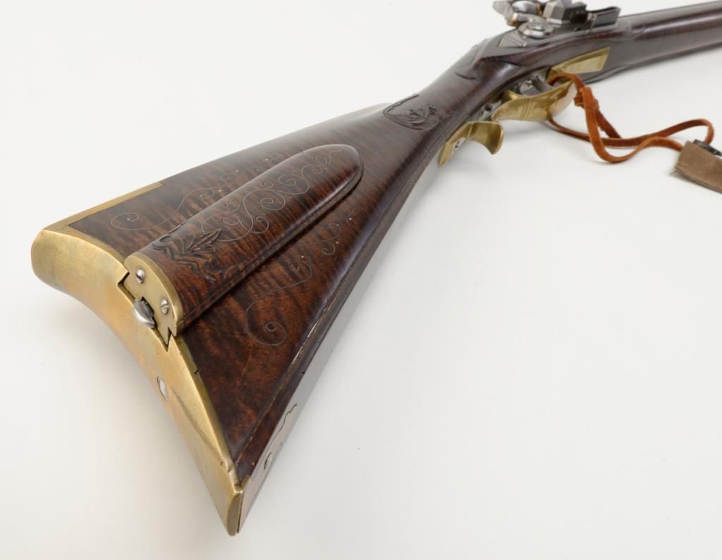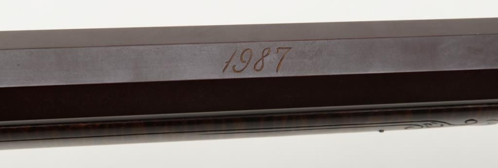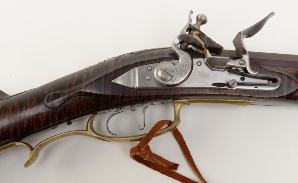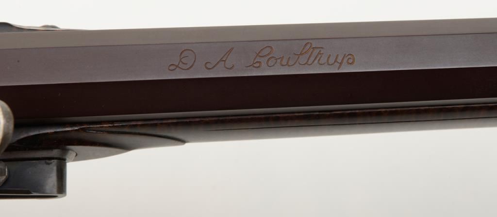 Beautiful modern handmade flintlock Kentucky style rifle, .58 cal., 47-1/2" octagon barrel signed "D. A. Coultrup" and dated "1987" with "DC" impression on left barrel flat at breech; raised carved deluxe wood stock with wire inlay and wood patchbox; brass ferrules, end cap, trigger guard and butt plate; double set trigger. This true work of gunmaker artistry is in overall fine condition showing little handling, fine workmanship and beautiful graining to the wood from the butt stock to the fore end tip. To have this rifle replicated today would costs several times the estimated auction value. Est.: $750-$1,500.