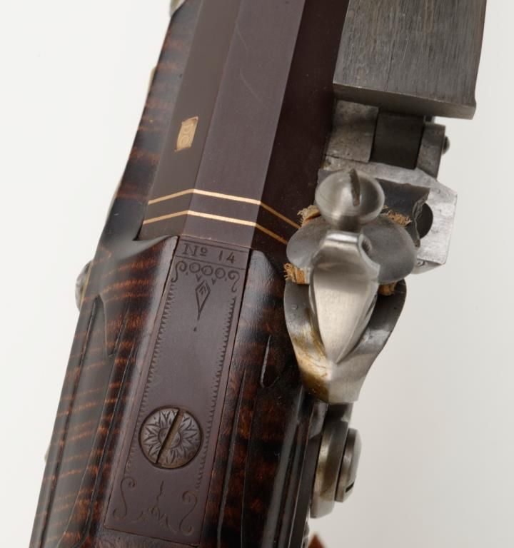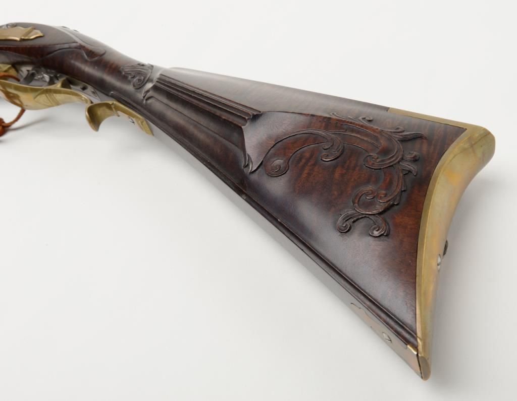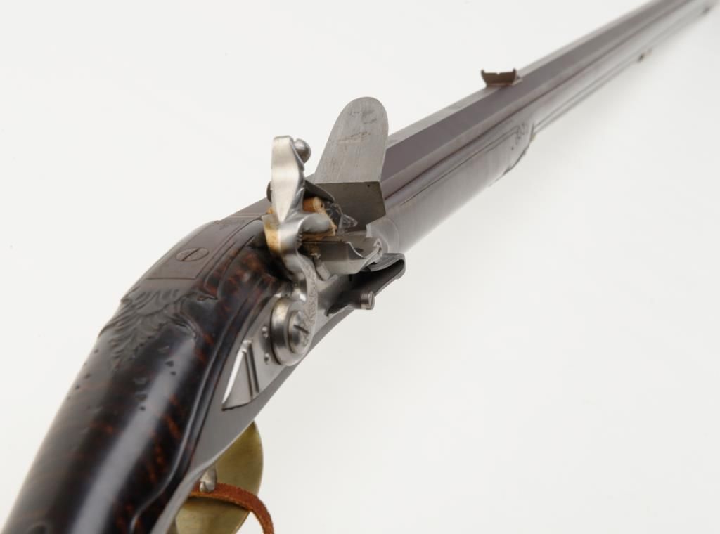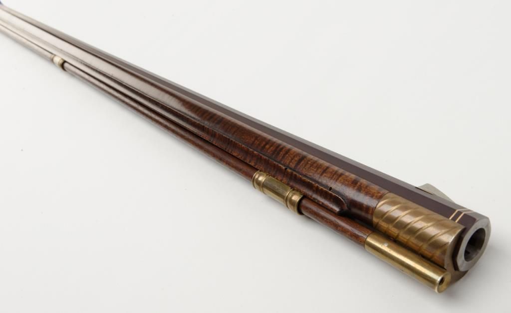 Beautiful modern handmade flintlock Kentucky style rifle, .58 cal., 47-1/2" octagon barrel signed "D. A. Coultrup" and dated "1987" with "DC" impression on left barrel flat at breech; raised carved deluxe wood stock with wire inlay and wood patchbox; brass ferrules, end cap, trigger guard and butt plate; double set trigger. This true work of gunmaker artistry is in overall fine condition showing little handling, fine workmanship and beautiful graining to the wood from the butt stock to the fore end tip. To have this rifle replicated today would costs several times the estimated auction value. Est.: $750-$1,500.