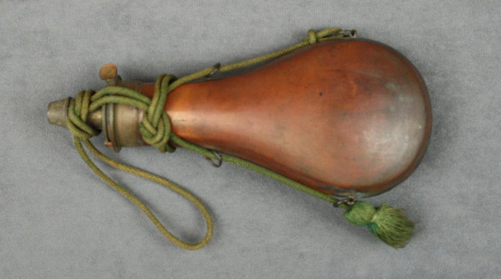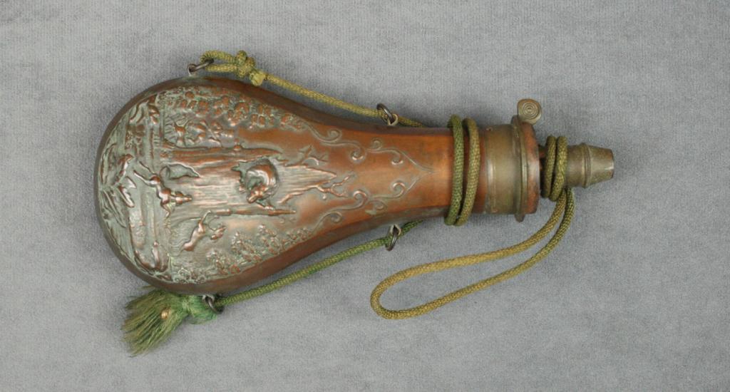 Beautiful old brass shotgun powder flask with  embossed game scene showing two dogs treeing  a bear with brass charging spout and hanging  chord.  Est.:  $75-$150.