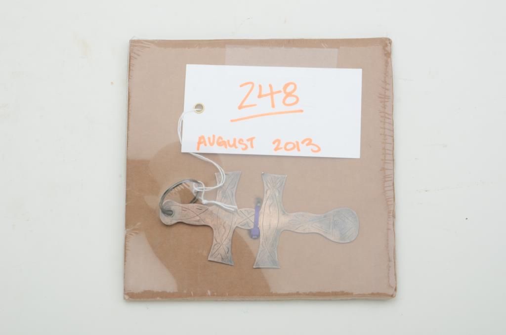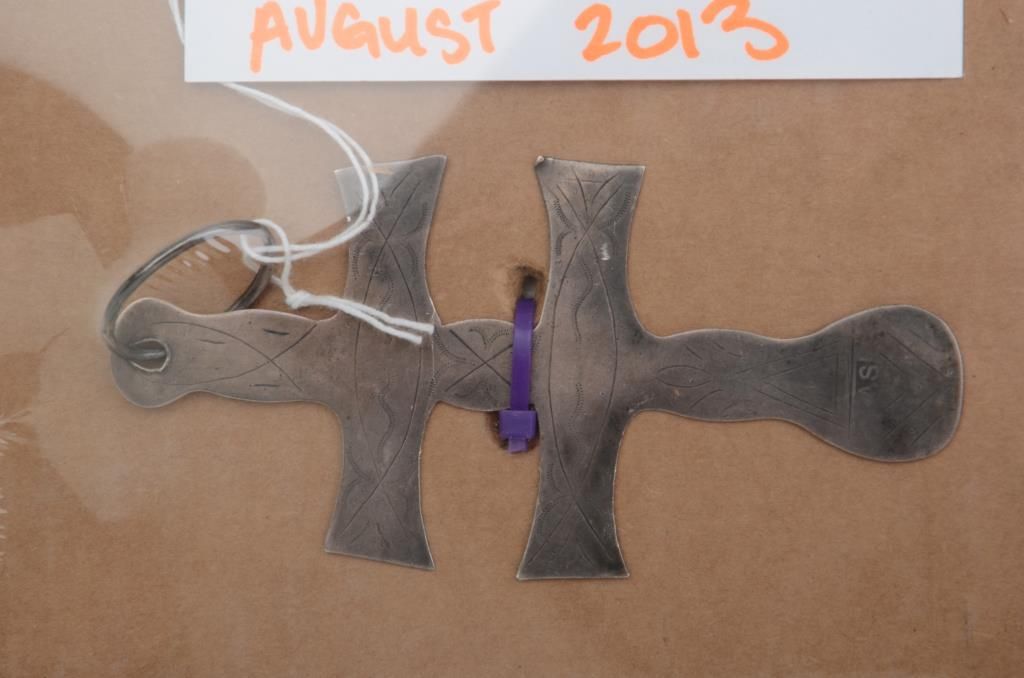 Beautiful old silver trade Cross of Lorraine, approx. 4-1/2” long and hallmarked with an “AS” (possibly Anthony Simmons), in overall good condition showing even wear, engraving to both sides and a beautiful patina. This is the type of silver ornaments that were used in the Indian trade in the late 1700s; according to a publication of the Minnesota Historical Society (Museum Exhibit Series No. 2: copy of pages 59 and 100), this type ofsilver ornament was a major trade item during the aforementioned period and were made mostly in Philadelphia, Albany, Montreal and Quebec; the pieces were sold more as decorative rather than religious pieces;information card from Ramona Morris of Woodside, CA indicates the AS hallmark, Anthony Simmons, was of Philadelphia in the period 1796-1808. A really beautiful and important piece for the early Americancollector. Est.: $400-$800.