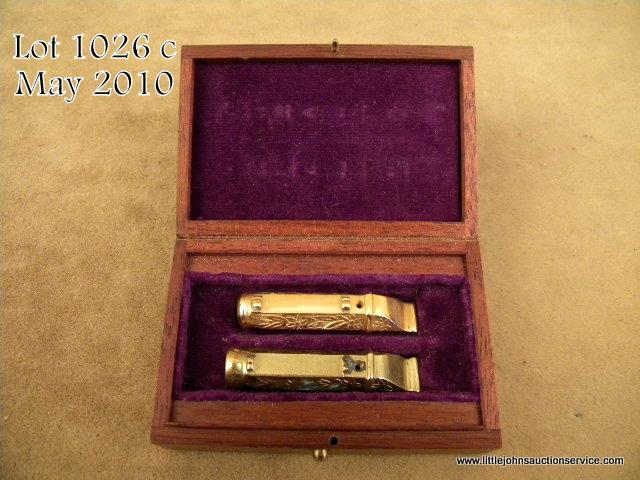 Beautiful pair of miniature gold washed brass  matchlock pistols in custom made wood presentation  box with purple lining, approx. 1-3/4” overall  (each) and marked “LHS 25” and LHS 27”, both in  overall very good condition.  Est.:  $300-$600.