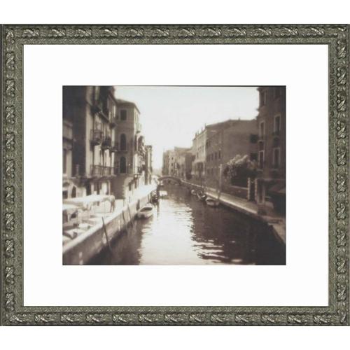 This beautiful photograph of Venice, Italy was tastefully taken using a smoky filter that gives the piece a soft feel, almost like a memory of being there. It measures 8? x10? and is monochromatic giving the viewer a sense of nostalgia. It is framed in a striking silver wood frame that has the look of having been custom made for this photo. It is very ornate and sandwiches the photo between two panes of glass that make the picture appear to float within the frame. The entire piece is 13.5? x 15.5?.