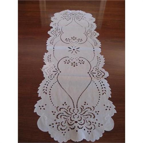 beautiful cut work runner with scalloped edge, in very good condition measuring 16 by 44 long.