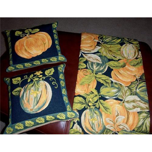 Beautiful set of tapestry pillows with pumpkins and the colors are excellent. The large tapestry can be a wall hanging or accent rug.