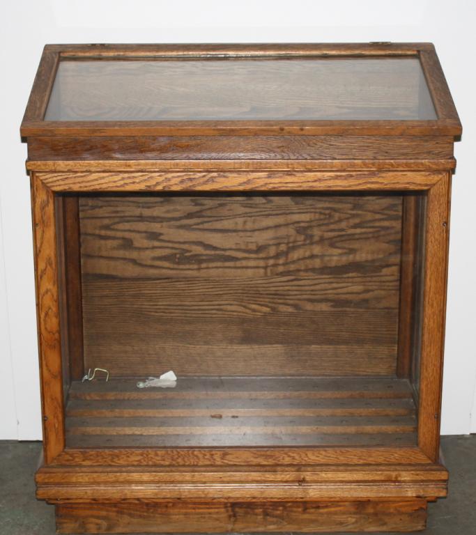 Beautiful wood and glass cane stand approx., 42-1/2” in height, approx. 36-1/2” wide and approx. 19-1/2” deep with ability to hold over 50 collector canes; base of stand has glass on three sides and the lid that opensto the top also has glass for viewing the heads of the canes. Est.: $400-$800.