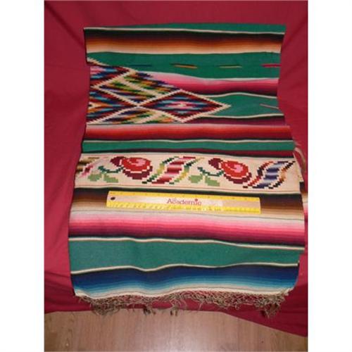 This is a beautiful Mexican blanket. It is quite old with wonderful trim rolled twine. The colors are so rich and festive. The age shows but there is nothing wrong with this great Mexican throw/blanket.