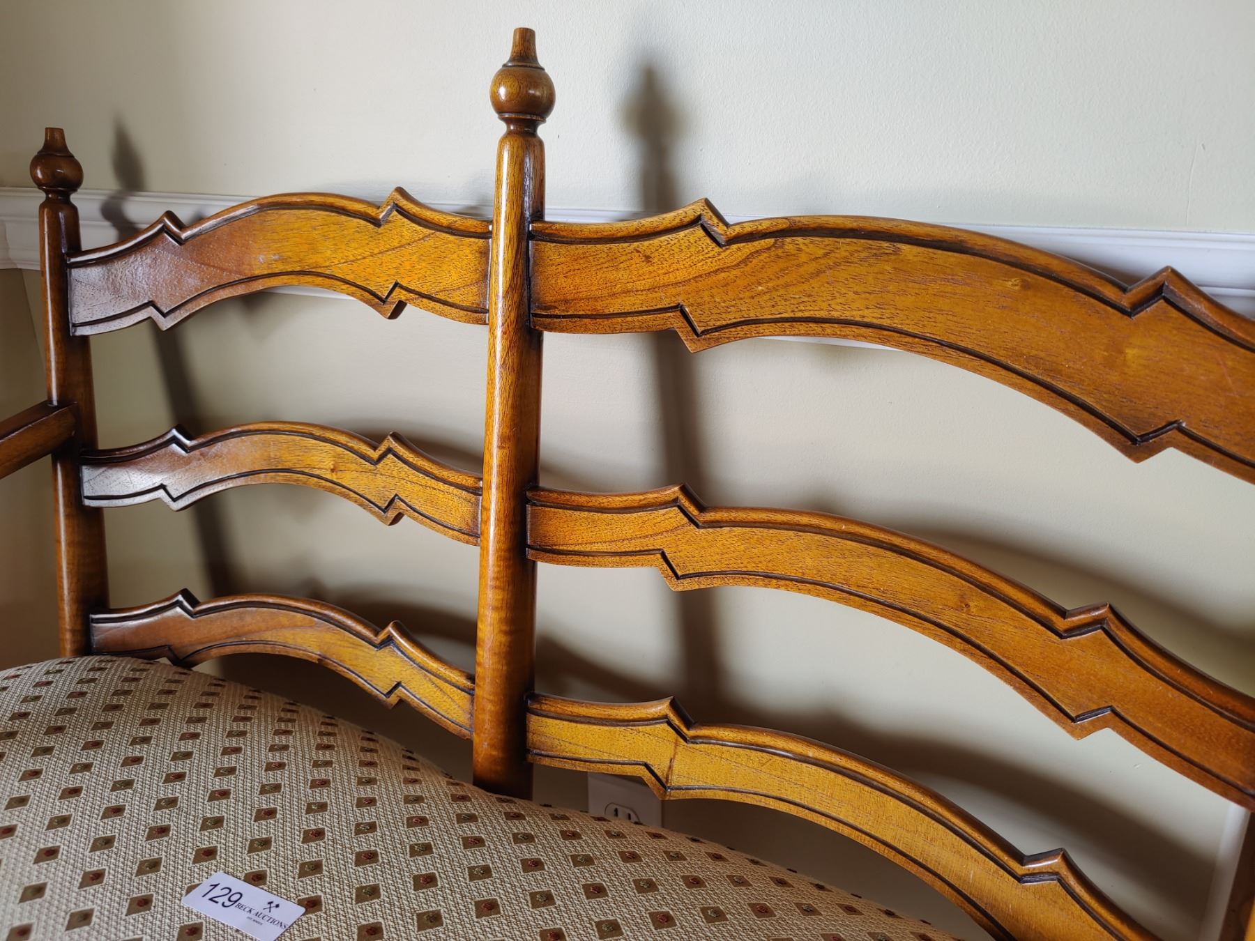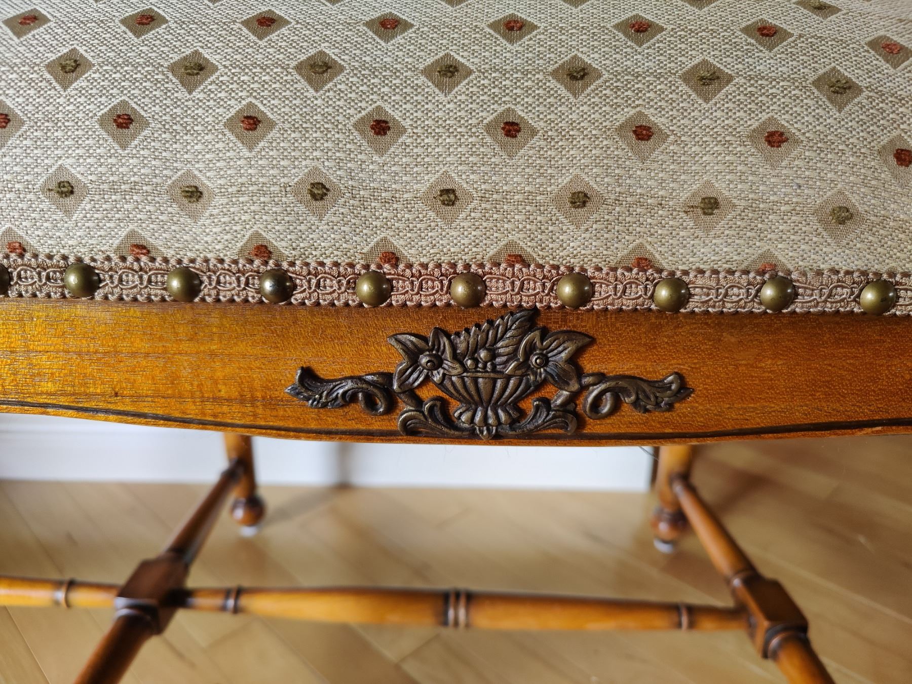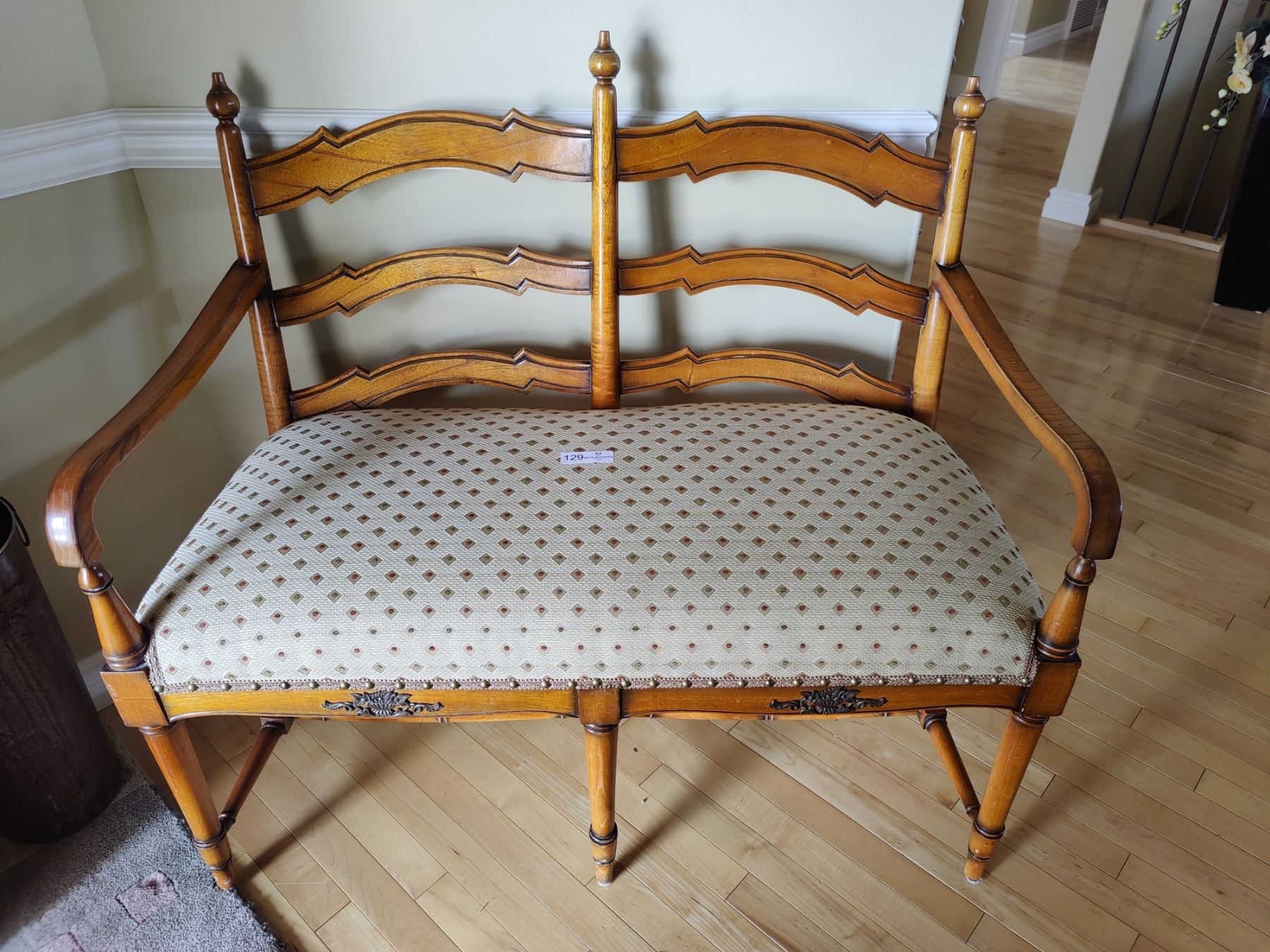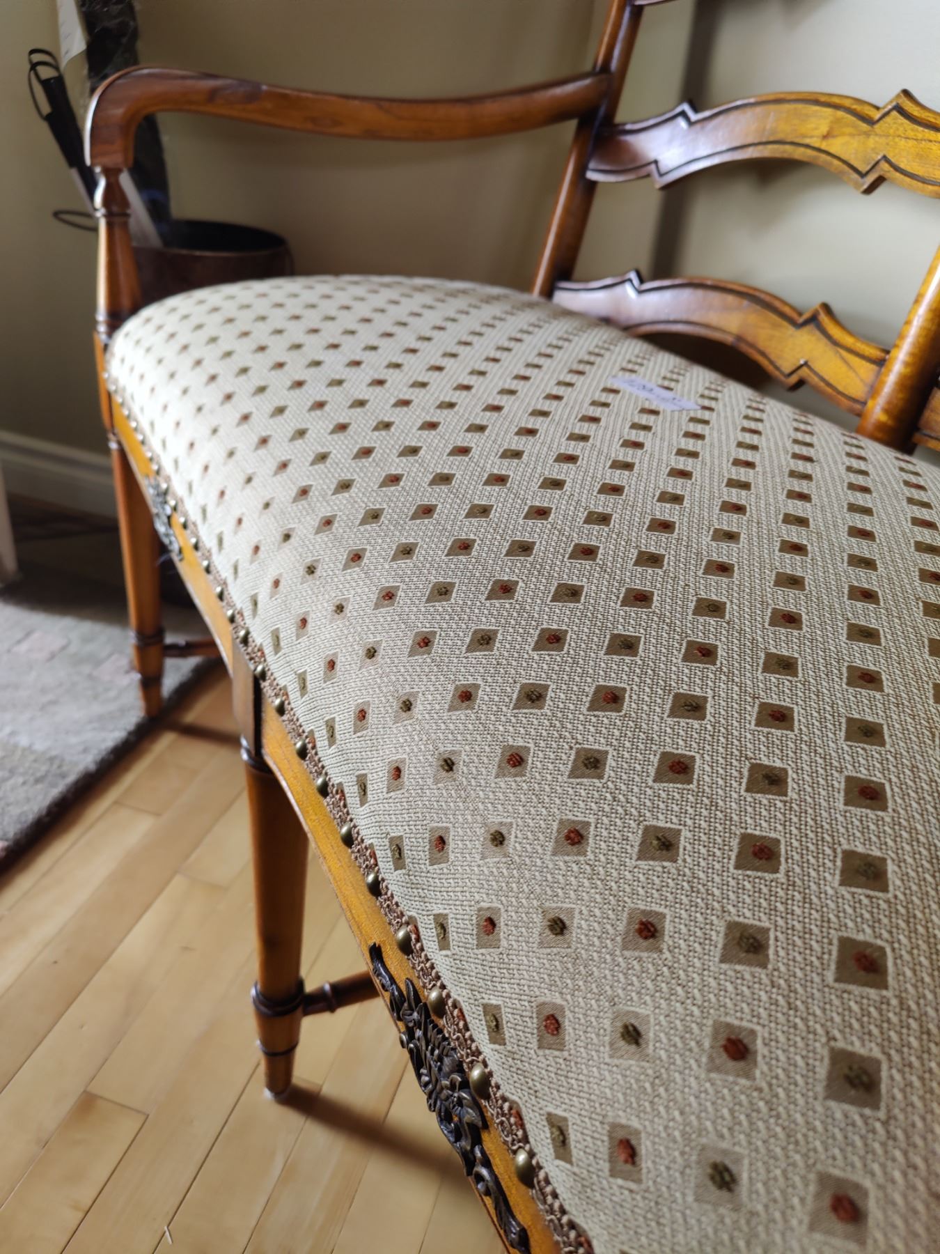 Excellent condition, virtually brand new. Very beautiful fine detailing and upholstery. 42" wide, 20" deep, 39 tall.