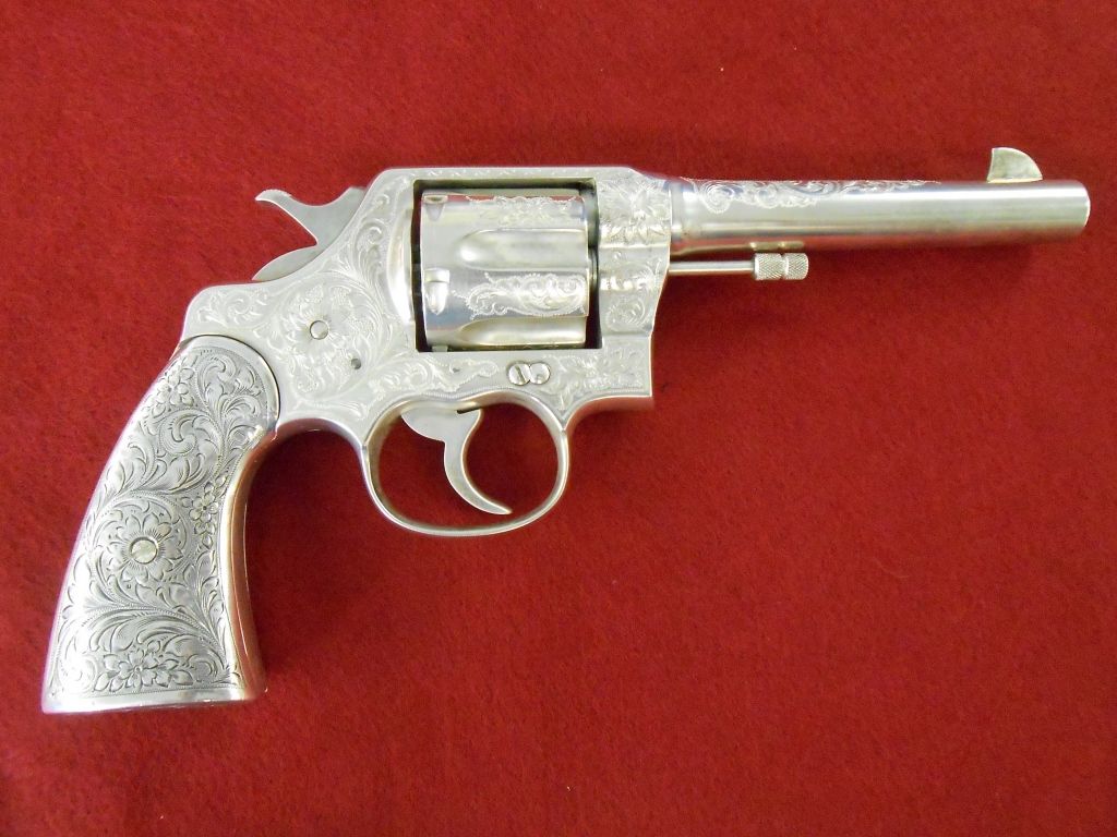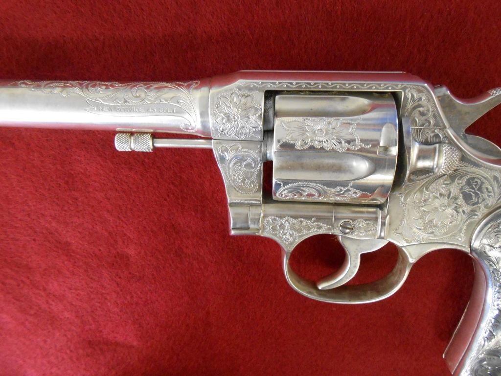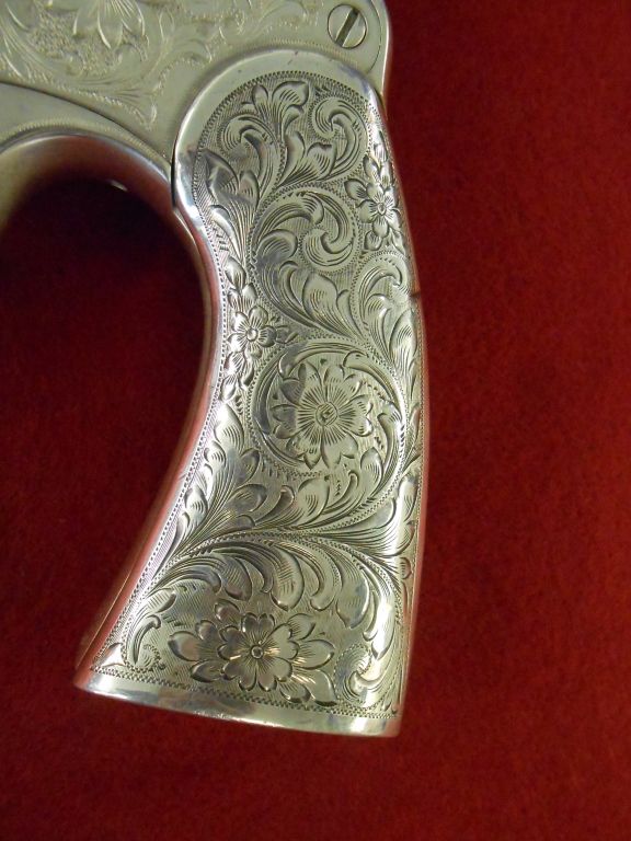 New Service, with Factory Engraving, Silver Plated, Outstanding Beautiful Engraved with Bohlin Silver Grips, Former Texas Ranger Gun 45 Cal., Very Collectible Rare Piece. Reputably Belonged to a Texas Ranger.