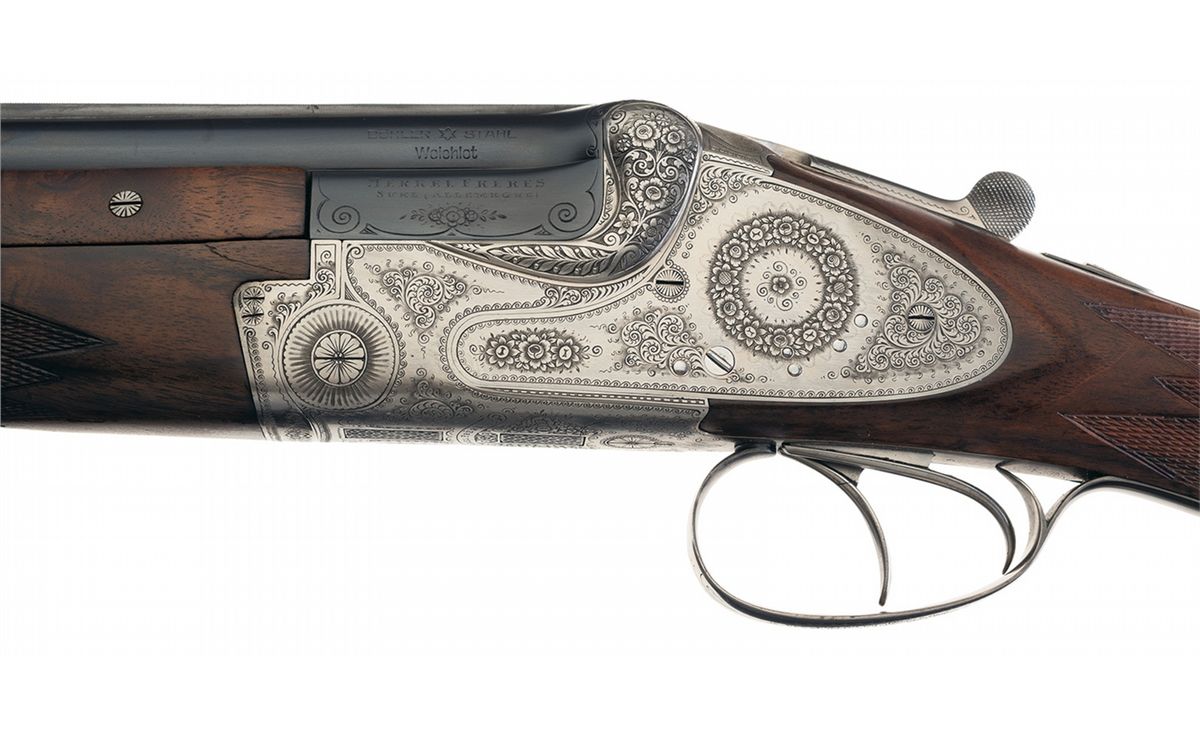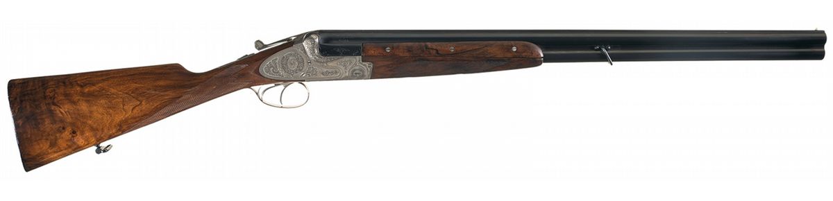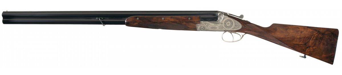 This shotgun has expertly executed flourishes of floral scroll engraving on the lock plates, receiver, trigger guard, break lever and forearm hardware. There is also rose bouquet engraving on the lock plates, bolsters and on the bottom of the receiver. There is a tang mounted safety, cocking indicators on the locks and double triggers with the front articulating. The barrels have a single white bead sight on the hand matted rib are choked .015/.042 and have 2 3/4 inch chambers with ejectors. The top left and right of the top barrel at the breech is stamped "BOHLER (star) STAHL/Weichlot". The left barrel shoulder is engraved "MERKEL FRERES/SUHL (ALLEMAGNE)". The water table is stamped with the serial number "18725", with an eagle proof mark and with a "Crown/U" proofmark. The bottom of the barrels are stamped with "18725/12/BOHLER (star) STAHL", "FB" and with "Crown/S" and eagle proofmarks. The matching serial number is stamped inside the forearm iron and is engraved on the lower tang. The barrels are blue with the remainder of the components bright. Mounted on a nicely figured, multi-point checkered three-piece walnut forearm and straight grip stock with checkered horn buttplate. Length of pull is 14 inches, drop at comb is 1 1/8 inch, drop at heel is 2 3/8 inches and an 1/8 inch of cast off.