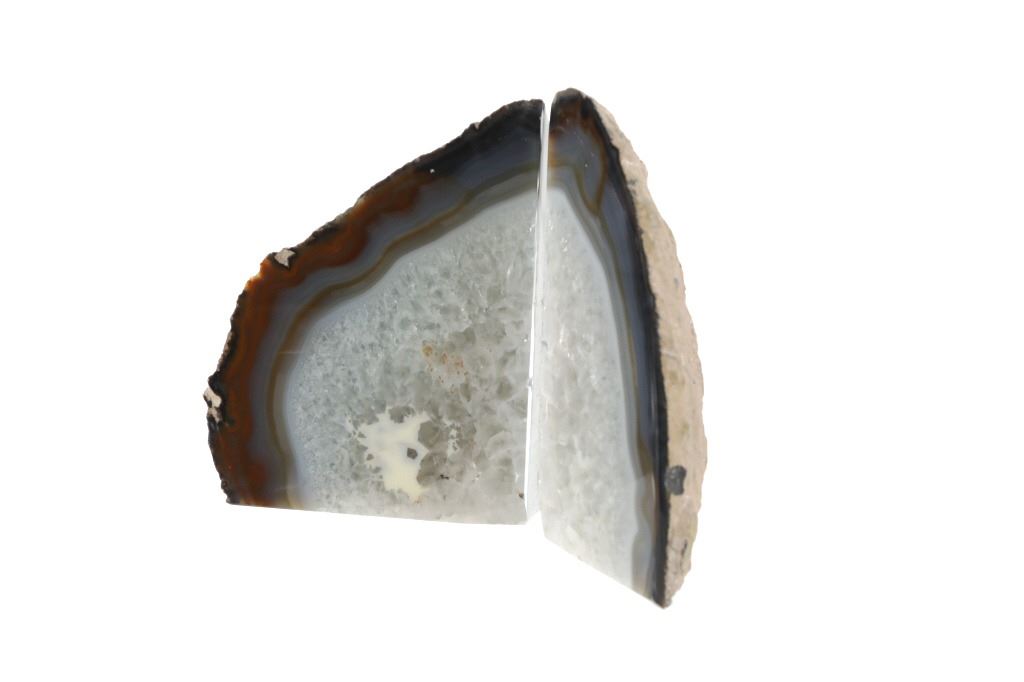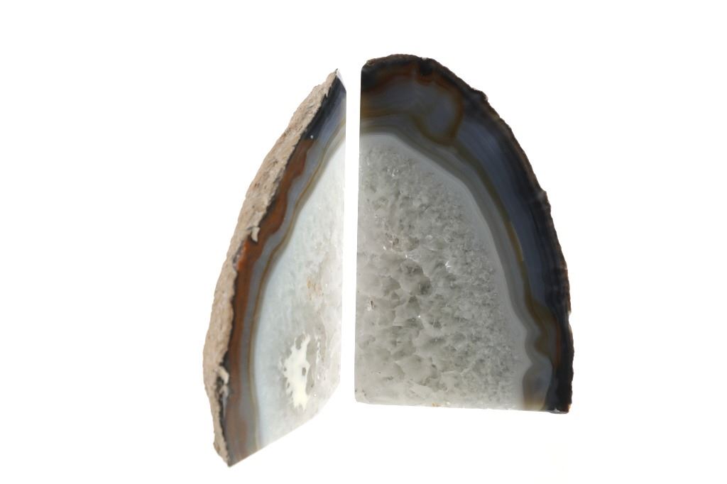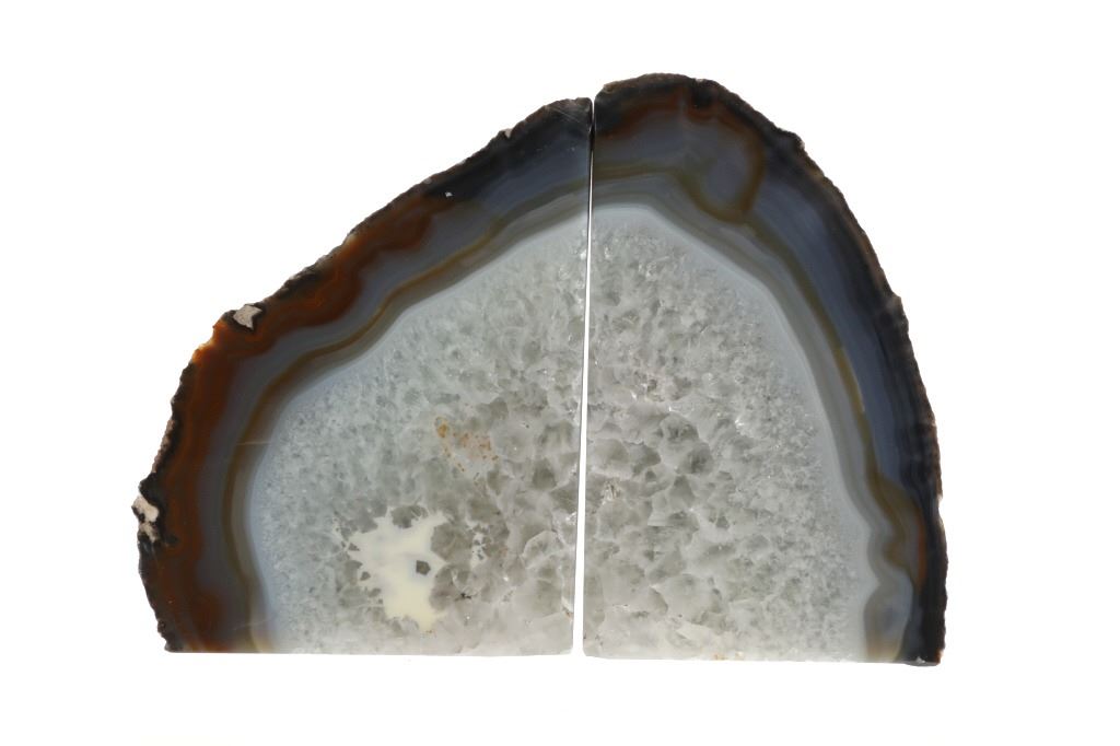 Featured in this lot is this pair of beautifully, polished geode bookends from the 20th century. Geodes are spherical to subspherical rock structures with an internal cavity lined with mineral materials. They have a durable outer wall that is more resistant to weathering than the surrounding bedrock. This allows the geode to survive intact when the surrounding bedrock weathers away. The mineral lining the cavity is often a scintillating druse of tiny quartz crystals underlain by multiple bands of translucent gray and white agate. Many are lined with more spectacular treasures. These geode bookends shows colors of white, gray, blue, light blue, teal and burnt orange / brown. They are cut nicely and highly polished with the exterior kept in its original condition. They show good condition overall with no signs of damage present. They measure from 2" L x 4 3/8" W x 7 1/8" H to 2" L x 5 3/8" W x 6 3/4" H and have a collective weight of 6 pounds.