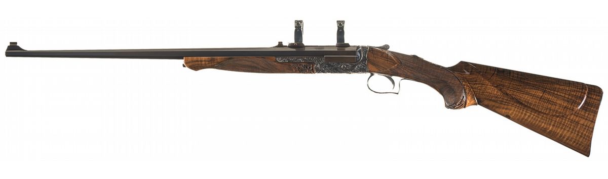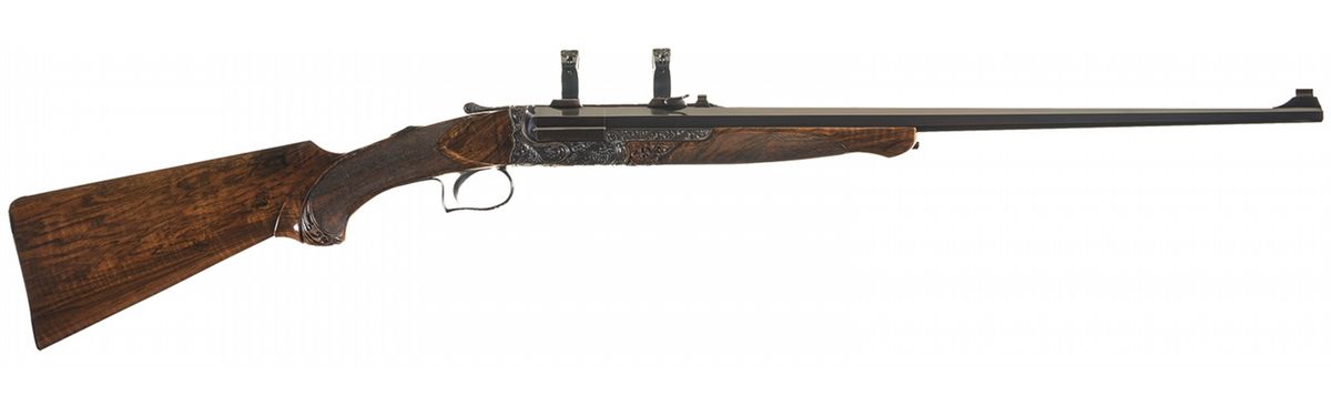 Beautifully Relief Chiseled Engraved and Precious Metal Inlaid B. Bradshaw Signed Master Embellished Single Shot Stalking Rifle with Relief Carved Stock