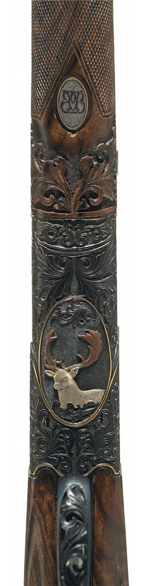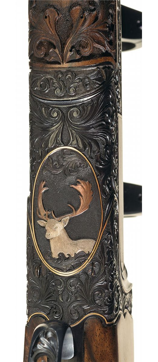 This example has masterfully executed deep relief floral scroll engraving on the blitz action receiver, on the safety switch, on the break lever, on the pierced trigger guard, on the forearm knuckle, on top of the quarter rib of the barrel, on the top of the scope rings and on the heel and toe plates. There is a relief inlaid bust of a deer in an oval on the under side of the receiver. The body of the deer is in silver with the antlers in copper. There are several gold wire inlays. One outlines the oval on the bottom of the receiver, one follows the back edge of the receiver and the last follows a flowing ridge. The front sight is a gold beaded blade and the rear sight is fixed with a line of gold inlay down the "V". The water table is engraved "B. BRADSHAW 1" and the left side of the barrel lug is engraved "B. BRADSHAW DIANA, TX./7x57R". The barrel is a Shilen which Bradshaw machined from a blank. Mounted on a beautifully figured, multi-point checkered and floral scroll relief carved Turkish walnut forearm with Schnabel tip and "EVB" initial oval outlined in gold wire and a pistol grip stock with raised cheekpiece and floral scroll relief carved butt with heel and toe plates.