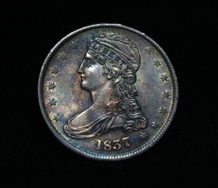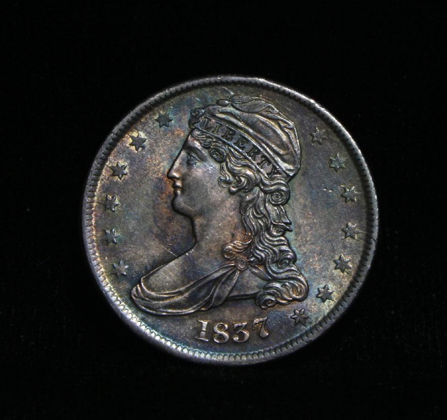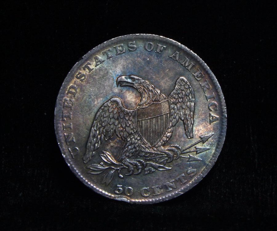Beautiful Toned capped Bust half. It is a Great Lustrous example, with fantastic all original colorful toning. A superior example. Coin World's Coin Values lists an untoned example grading ms63 at $3000 and The Wholesale Greysheet lists a non rainbow example grading ms63 at $1800. Estimated Value $2500