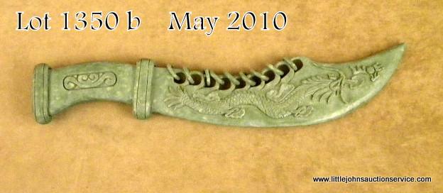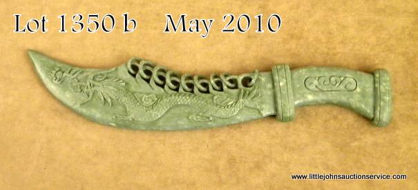 Beautifully accomplished large jade ceremonial knife approx. 20” overall with an approx. 14” blade in overall excellent condition showing a carved serpent on both sides of the blade with cutouts and jade rings that were no small task tocarve; the massive grip has an oval cross guard and oval pommel. Est.: $200-$400.