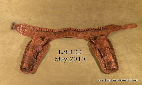Beautifully and extensively tooled double loop, double holster rig for a pair of Colt SAA revolvers with 7-1/2” barrels, no visible maker’s marks; with square belt buckle. This fancy rig is in overall very good condition and appears to becirca 1940’s to 1950’s; rawhide stitching on the holsters and the double loops where they attach to each holster’s skirt; cartridge loops are large to accommodate .45 or 44-40 caliber shells. Est.: $100-$200.