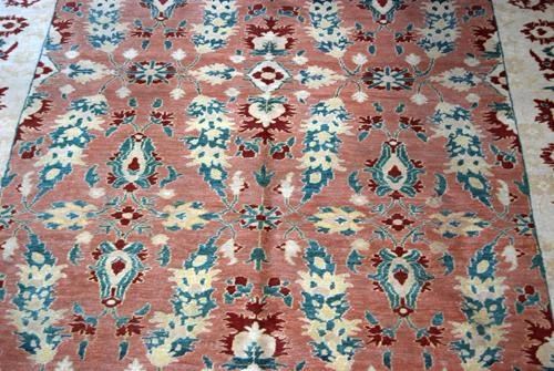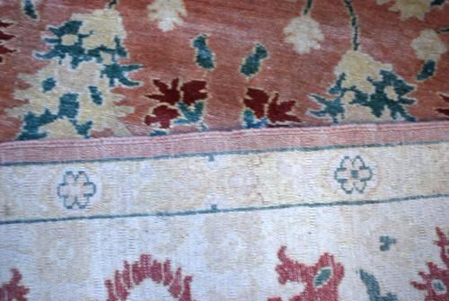 Beautifully contrsated authentic Egyptian Rug. Made of fine quality lamb's wool pile on cotton foundation, all natural vegetable dye, this beautiful rug incorporates some lovely and vibrantly colored floral motifs allover and is encapsulated beautifully by an intricately done floral border. a great utilization in the variation of colors used in creating this wonderful Rug. Size 7 feet 7 inches X 6 feet 10 inches. Hand woven in Egypt.