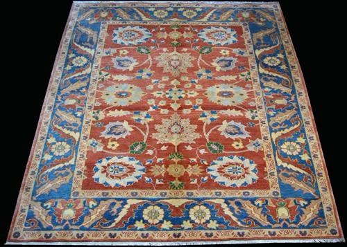 Nicely contrasted Egyptian Rug. Made of fine quality lamb's wool pile on cotton foundation, all natural vegetable dye, this bautiful rug incorporates a set of highly decorated floral motifs on a rich red background. With very rare and nicely defined colors, and encapsulated by an intricately done blue floral border. Hand woven in Egypt. Size 6 feet 10 inches X 5 feet 1 inch.