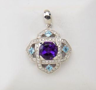 Beautifully crafted and designed pendant in 18k white gold set with a center checkerboard cut amethyst framed with diamonds and accented with 4 princess cut aquamarines. Est. $2,000-$3,000