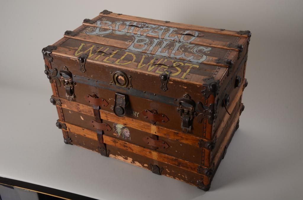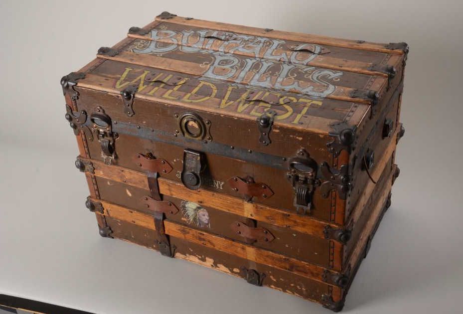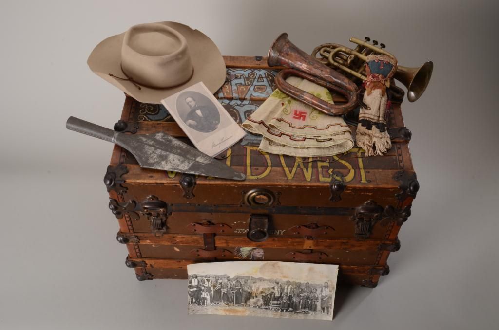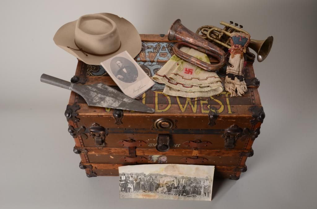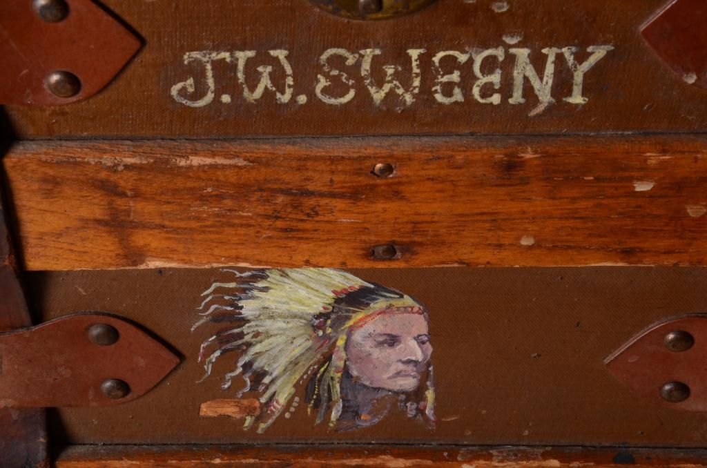 Beautifully decorated steamer trunk belonging to William Sweeny, Band Director of Buffalo Bill's Wild West Show and the 101 Ranch where he led the cowboy bands. The trunk is nicely painted with a portrait of Indian onfront, Sweeny's name in block letters, and legend Buffalo Bill's Wild West on top. The trunk contains: a Millers Brothers 101 Ranch hat that is well marked, size 7, 18X in near fine condition; another 101 Ranch hat ofsmaller size, 6X marking, small loss on brim but otherwise near excellent; an embroidered textile with sun sign; a native American doll, early 1900s, possibly made by performer in show as there were many Indianperformers; a pair of child's beaded moccasins with #11 stamped in each sole; a gun belt and holster, 45 loops and 12 gauge, showing 101 mark; a souvenir tin spear point; an old belt and holster rig with brassspots; an old slim jim holster from western period; a Shumaze cutlery cord; a pair of Bloom Brothers infant souvenir mocs with original tag, barely visible Pawnee Bill's Wild West Show; a performer's pair of Indian