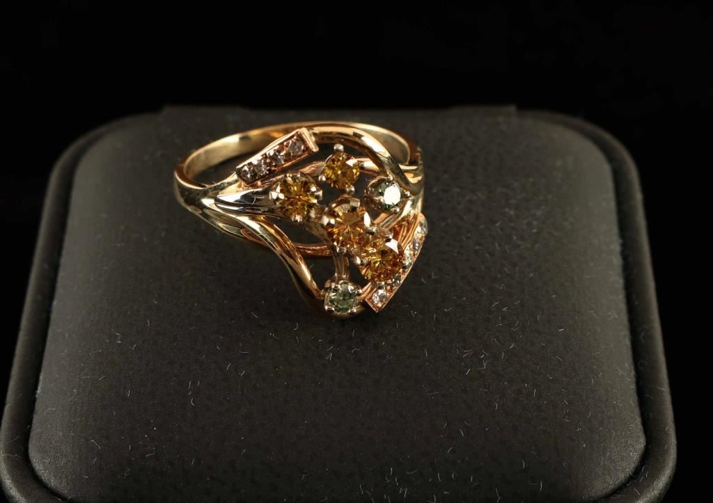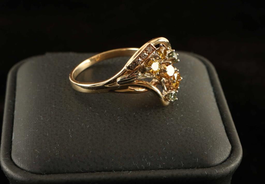 Ring In 14k Yellow Gold Set With 4 Fancy Yellow Diamonds, 2 Blue Diamonds,and 8 White Diamonds Weighing A Total Of 0.86cts, size 11.