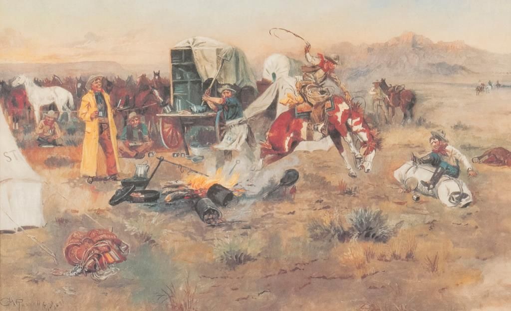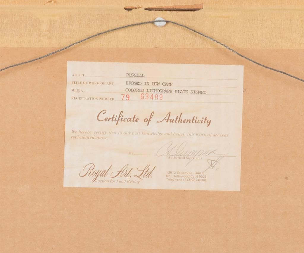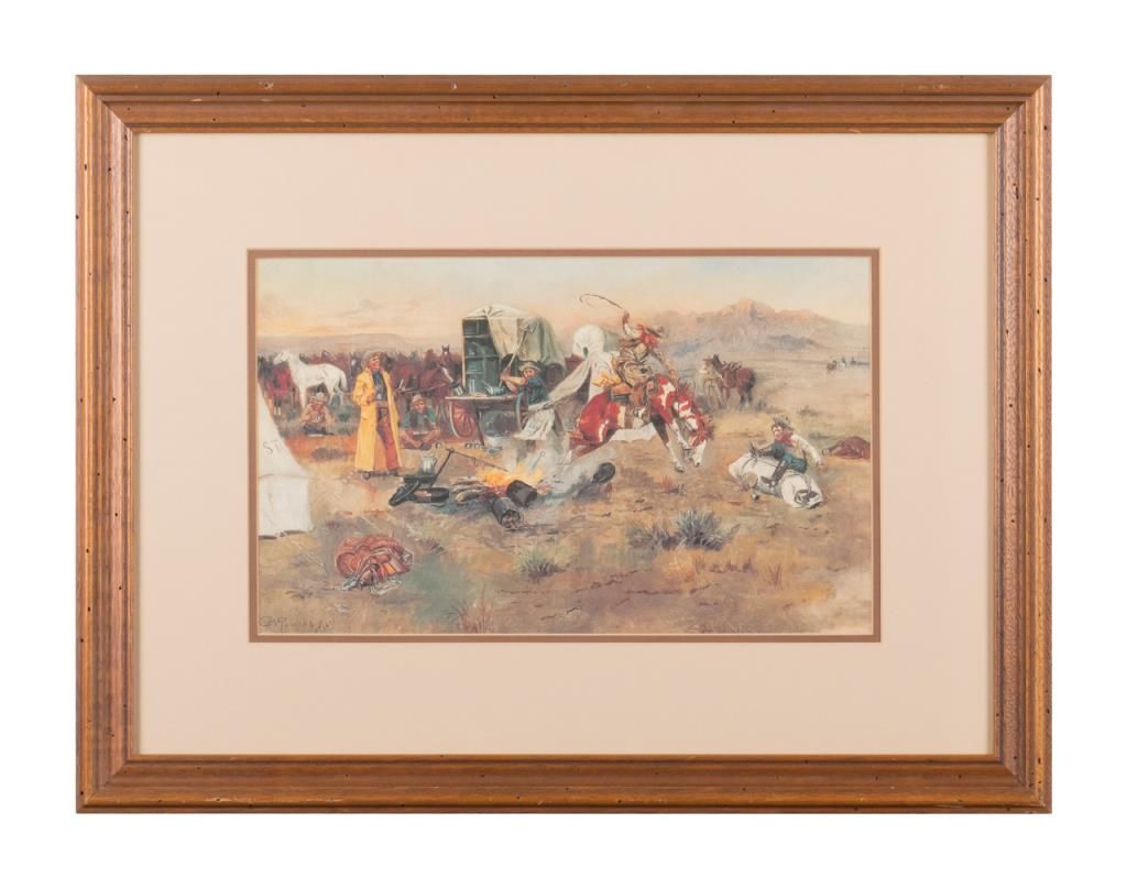 Beautifully framed and matted Charlie Russell colored lithograph entitled “Bronco in Cow Camp” approx. 19” x 24-1/2” in fine condition. Est.: $50-$100.