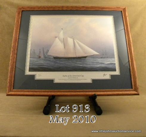 Beautifully framed and matted signed by H.  Thompson Special Edition yachting print entitled  “Yachts of the America’s Cup; The Schooner” ,  approx. 25” X 31” overall and in fine condition; a  great decorator for the sailor’s den or office;matching to piece sold previously in this auction  at Lot 906.  Est.:  $75-$150.